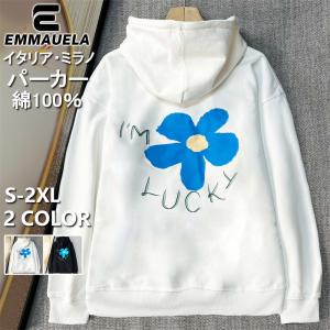 パーカー 長袖 EU製 Emmauela ミラノ発 綿100% 保温 花柄 シンプル ゆったり カットソー トップス プルオーバー フーディー 男女兼用 カジュアル