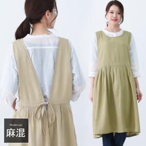 麻混 Vネック ワンピース エプロン 無地 ゆったり 綿 コットン リネン 麻 シンプル ロング ワンピースエプロン 保育士 ロング ギフト おしゃれ かわいい 母の日