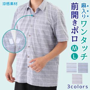 前開きポロシャツ メンズ 半袖 ワンタッチテープ シニア 麻混 涼感チェック柄 M/L/LL 着脱簡単 おしゃれ カジュアル 上品デザイン 洗濯機OK