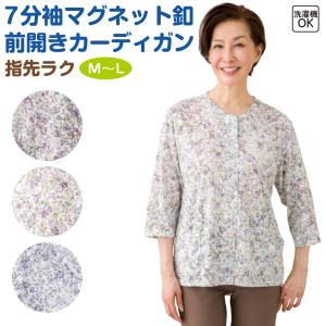 婦人 7分袖 マグネット釦 前開き カーディガン 小花柄 M〜L 指先らく ゆったり 後ろ身頃長め ポケット付 名前欄付 洗濯機OK 春夏