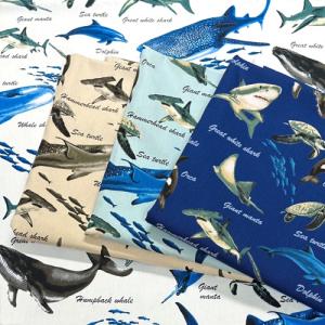 【50cm単位】【2mまでメール便対応】 くじら 鮫 イルカ 海の生き物 オックス 白 ホワイト 青 ブルー 水色 きなり 生地 日本製 布 プリント ハンドメイド 男の子