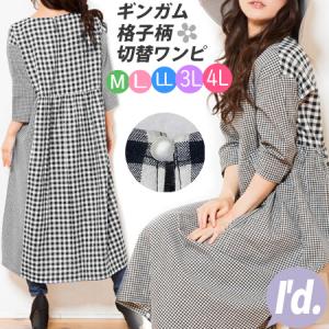 綿混 薄手 ギンガムチェック ブロック チェック柄 格子柄 ロング丈 ワンピース 七分袖 半袖 ロングワンピース 春夏 ゆったり 丸首 シャツワンピ マキシ 3673