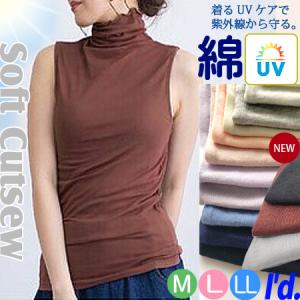 【送料無料】全14色 紫外線UVカット加工 やわらか 薄手 綿 ノースリーブ ボトルネック カットソー レディース タートル インナー 春夏秋 M L LL 9622