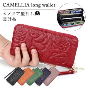 長財布 レディース 財布 牛革 本革 カメリア 花 フラワー 型押し ラウンドファスナー 大容量 ロングウォレット 通帳収納 小銭入れ付き コイン入れ カード入れ