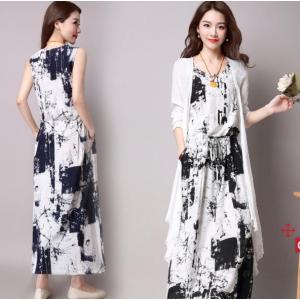 レディース セットアップ マキシワンピース カーディガン 夏 ノースリーブ プリント カジュアル ゆったり コットン ロング丈 ワンピース XLサイズ