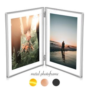 フォトフレーム 2L判 2面 ガラス 2枚 写真立て メタルフレーム 見開き 縦長 ウェディング おしゃれ 透明 クリア かわいい 折りたたみ 金 銀 黒