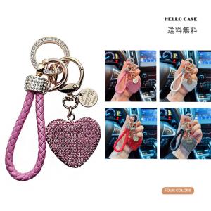 バッグチャーム キラキララインストーンカーキーチェーン 編み込みラムレザー調 上品 ハート型ペンダント付きキーリング キーリング レディース オシャレ