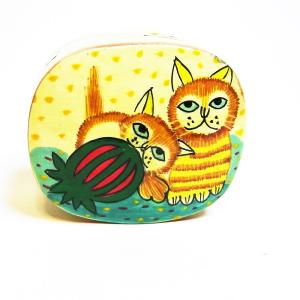 ネコ BOX ペーパーマッシュ 猫 小物入れ 可愛い 西瓜と2匹の猫 インド 手作り Sサイズ