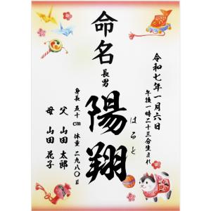 【名入れ】縁起物 命名書 毛筆書体 - 男の子 命名紙 / A4サイズ / ラミネート加工済み