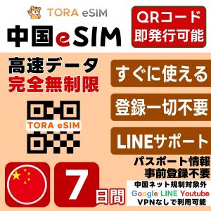 中国 eSIM | 7日間 | 無制限 | 最短15分QRコード自動発行(24時間) 即日発行 | 日本で設定OK | 中国ネット規制対象外 Google LINE YouTube VPN なしで利用可