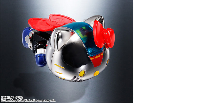 結果這兩位角色互換的超合金,真的好搶眼。先來說說「超合金Hello Kitty (無敵鐵金剛配色)」,外型與一般Hello Kitty無異,但電鍍上無敵鐵金剛的顏色,散發出金屬光澤,立即展現十足氣勢。雖然身後披的紅色披風,被換成超大蝴蝶結,但因為質感極好,也不覺得突兀,有為煥發英姿加到分。除了外型英挺,這款凱蒂貓可能是有史以來最「厲害的」,因為她有「水中」「行走」「飛行」三種模式,當這三種模式變形時,眼睛也會跟著變化,做的相當細膩,另外還可以從手腕發射金剛飛拳,這可是無敵鐵金剛的招牌招式,超強的。你有想像過Hello Kitty會發射武器嗎?最後,打開頭上的駕駛座,駕駛員小小Hello Kitty,是根據兜甲兒的配色下去製作,非常講究。
