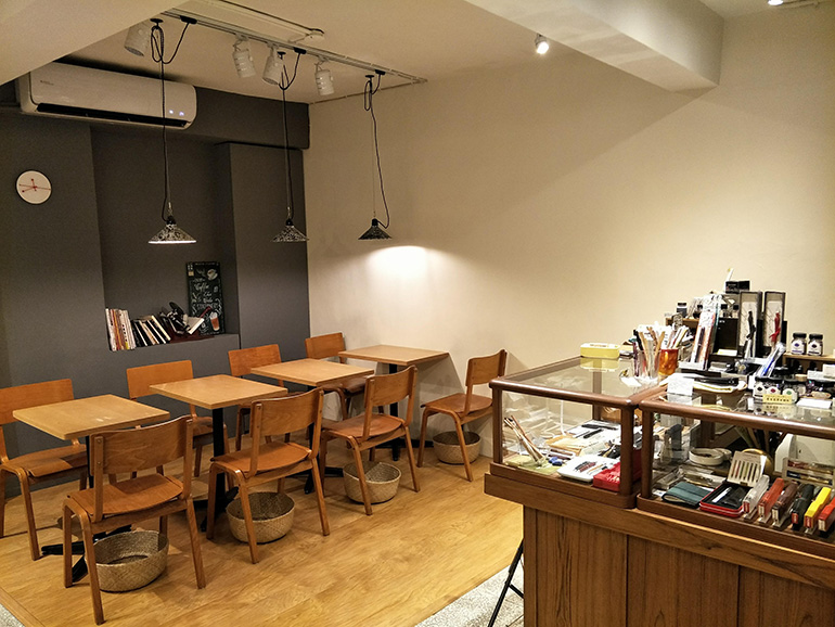 位於新生南路巷子裡的「直物文具café」, 是文具病的第二間店,第一間位於臨沂街,二店不同之處在於琳瑯滿目的文具之外,還加進了咖啡、甜點元素,提供簡單座位,讓客人在買完文具後,急著想試用時的一個自處空間。沈昶甫就說,有客人會在這兒寫卡片給未來的自己,而他們也會在此辦些紙鉛筆或小刀製作的工作坊。