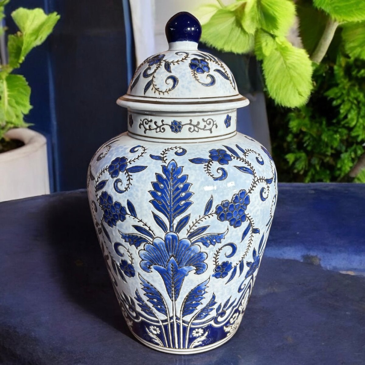 【FU10】生姜壺 [草花文絵] 中国雑貨 ジンジャージャー 伝統 花瓶 花入れ 丸壺 花器 セラミック 古美術 骨董品 アンティーク