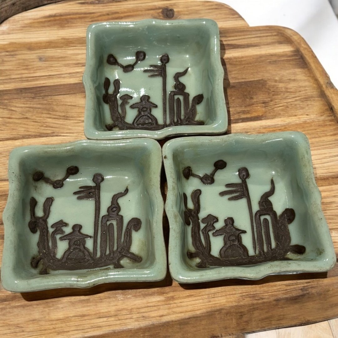 【FU10】某有名オークション買入 江戸 幕末 緑釉 手描き 当時物 小皿 3客セット アンティーク 骨董