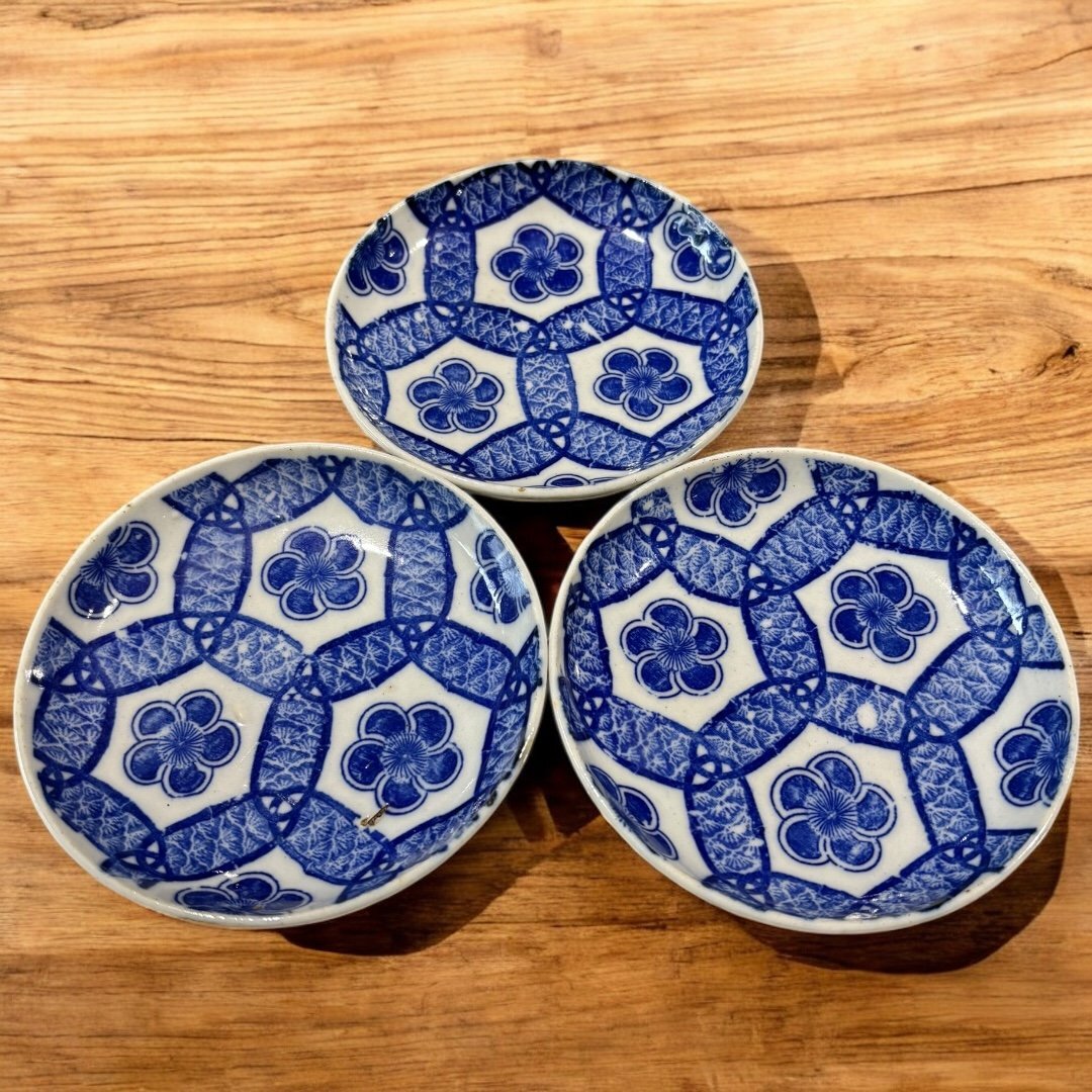 【FU10】旧家蔵 蔵出し 3枚セット 印判皿 明治期 希少 花草文様 骨董 小皿 直径12.5cm