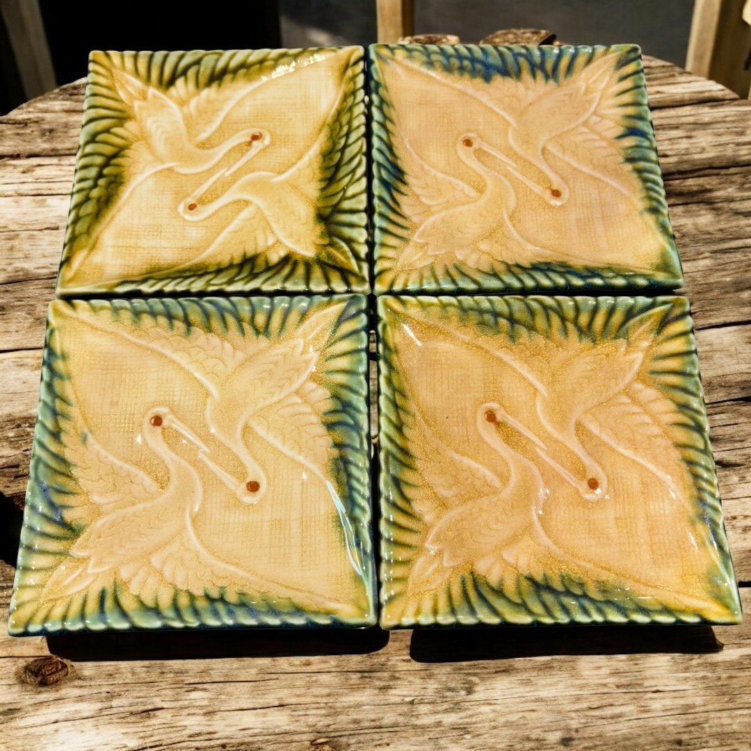 【FU10】4客揃え 鶴文 織部焼 美濃焼 平皿 直径12cm 食器 取り皿 盛り皿 アンティーク 骨董 四角皿