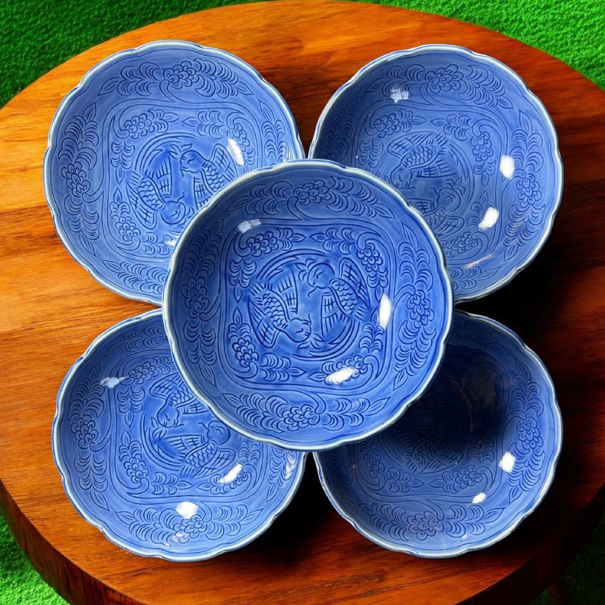 【FU10】【5客セット】林泉 丸皿 ブルー 草花鳥絵 なます皿 取り皿 盛り皿 飾り皿 和食器 骨董品 アンティーク