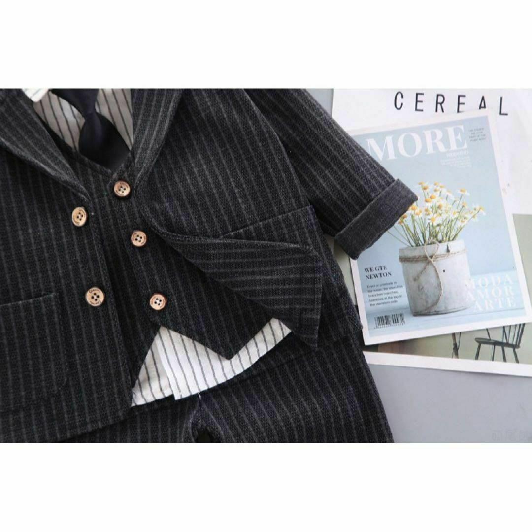 【お買い得な訳あり商品】 このスーツは、一部の縫い目が不完全なため、特別価格でご提供しています。 糸が飛び出している箇所は、自分でカットするか、裏側に隠れるので、そのままでも着られます。 写真でご確認ください。 【英国紳士風のキッズスーツ】 男の子のためのおしゃれなスーツセットです。 しっかりとした生地で、襟付きのジャケットとネクタイがフォーマルな雰囲気を演出します。 ネクタイは簡単に着けられるようになっています。 【着心地の良さ】 ズボンのウエストは伸縮性のあるゴムで、お子さまでも楽に脱ぎ履きできます。 生地はやわらかく動きやすく、お子様も不快感無く着られます。 【シーンに合わせて】 このスーツは、結婚式や入園式などのフォーマルな場面はもちろん、誕生日パーティーやハロウィンなどの楽しいイベントにもぴったりです。 お子さまの大切な一日を素敵におしゃれに演出します。 【セット内容】 シャツ、ズボン、ジャケット、ベスト、ネクタイの5点セットです。 【カラー】 ブラックストライプ。クールでスタイリッシュな印象です。 ■サイズ:100 上着丈:38cm バスト:29cm 袖丈:31cm 目安として 80サイズ…身長65〜75cm体重9kg 90サイズ…身長75〜85cm体重11.5kg 100サイズ…身長85〜95cm体重14kg 110サイズ…身長95〜105cm 体重17kg ※サイズタグが外側に付いてるので不要な場合はハサミで切り取って下さい。 結婚式パーティー卒業式入園式卒業式入園式結婚式正月発表会ハロウィン演劇お遊戯会コスプレ100日祝いクリスマスパーティーレストランひな祭り七五三パーティーレストラン初節句などオシャレにいかがでしょうか? ※サイズは多少の誤差がある場合がございます ※本商品は海外輸入品です。 カラー...ブラック 季節感...春、夏、秋、冬 柄・デザイン...ストライプ 柄・デザイン...ストライプ カラー...ブラック >