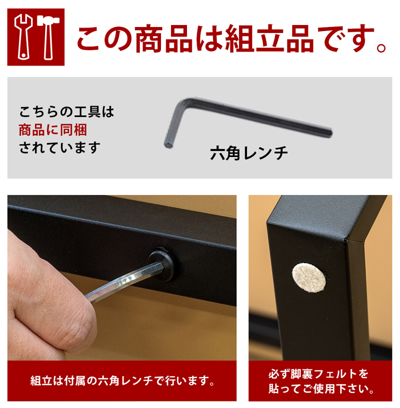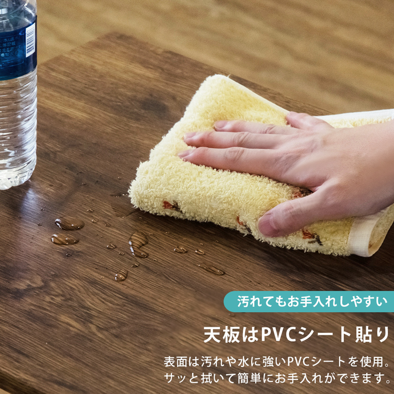 | 材質 | 天板:合成樹脂化粧繊維板(PVC) 脚:スチール(エポキシ粉体塗装) 脚裏フェルト4枚付属。 |