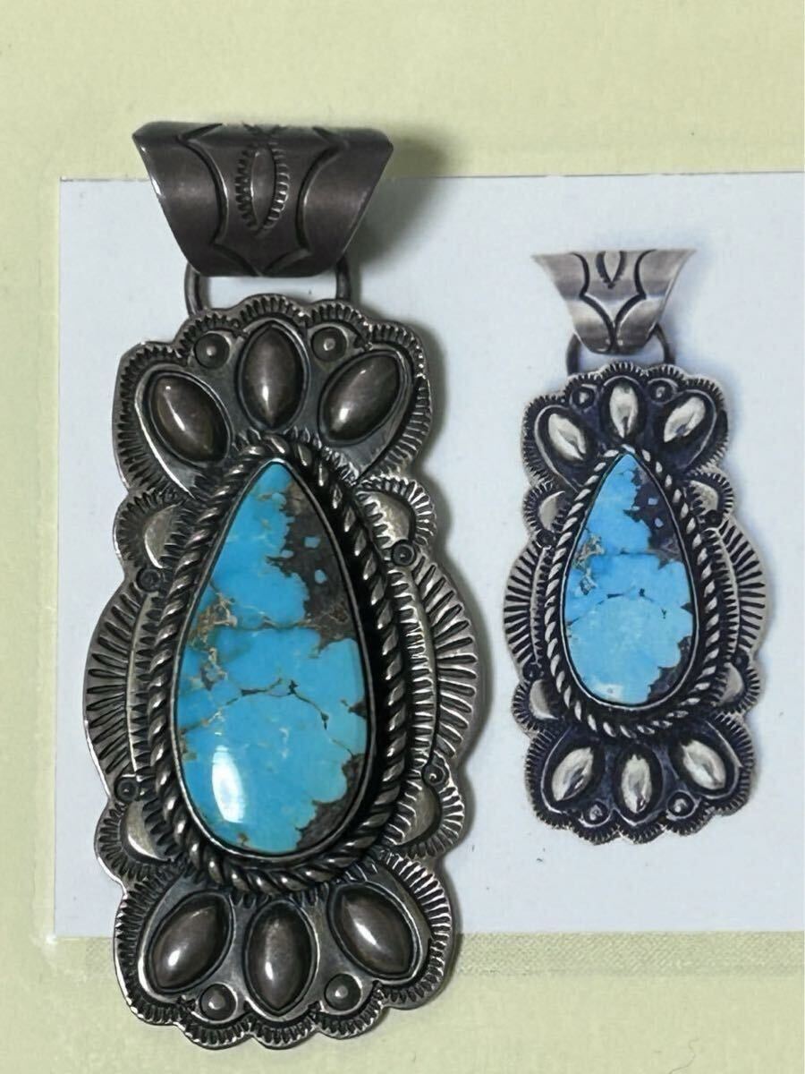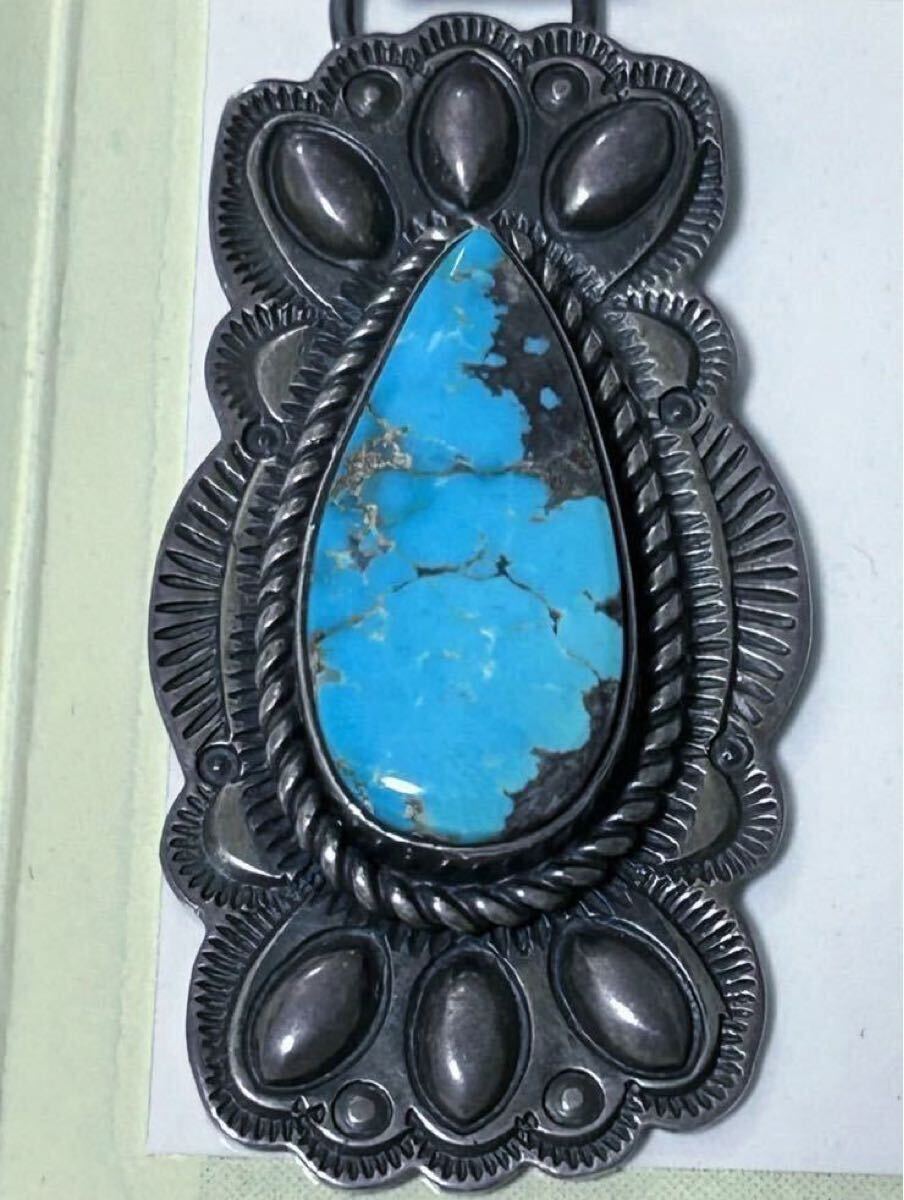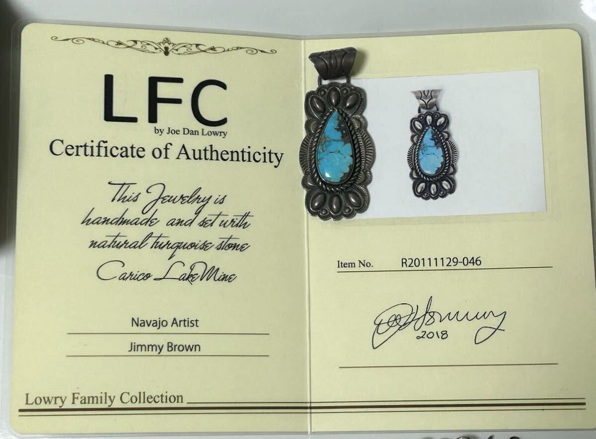 【希少/美品】LFCターコイズ ネックレスセット ナチュラル ターコイズ キャリコレイク ティアドロップ ペンダントトップ LFCギャランティ付属品 作家刻印 sterling刻印有り LFC x Jimmy Brown 商品情報 ブランド: LFC x Jimmy Brown 作者:Jimmy Brown ナバホ族 鉱山:キャリコレイク 【ターコイズ形状】 ティアドロップ 【アイテム詳細】 (ペンダントトップ) 重量 :約20g サイズ 縦 全長69mm(52mm) 横 28mm 厚み8mm ターコイズ 形状(ティアドロップ) 縦28mm 横14mm 【備考】 空や水のような透明感のある濃いブルーとグラデーションが美しいのターコイズです!しかも最近では珍しくなった左右対称のティアドロップの形状をした美しいターコイズです! キャリコレイクと言えば亜鉛を含むグリーンのターコイズが有名ですので、こちらはほとんどグリーンの入っていないキャリコレイク ターコイズとしては非常に珍しく希少な石だと思います! 状態は大きな傷はないですが、シルバー特有のくすみがあります。 ペンダントトップのLFCの証明書が付属します。 状態は良いと思いますがあくまで素人のコレクションですのでNCNRで中古品にご理解ある方のみ入札願います。 【LFCとは】 〈LFC(ロウリー・ファミリー・コレクション)〉は、ターコイズ界の第一人者であるジョー・ダン・ロウリー氏がプロデュースするハイクオリティのターコイズジュエリーです。ジョー氏は多くの博物館のターコイズに関する資料の監修・鑑定を行っており(ハードミュージアムやスミソニアン博物館、サンディエゴのマンミュージアム等) 、また自身でもアメリカ合衆国ニューメキシコ州アルバカーキ市にて「ターコイズ・ミュージアム」を主宰しています。LFCでは、至極の技術を持つアーティストと共に製作したターコイズジュエリーを、石のカラット数やグレード、アーティストの細工の内容等に見合った価格で販売しています。また、ジョー氏が一つ一つ時間をかけて厳選した石を使用し、趣旨に賛同するジュエリーアーティストにより製作されたものだけにLFCの証明となる専用の証明書を発行しています。ジョー氏によるこの証明書は唯一LFCのみに発行されるものであり、その他のジュエリーと明確に区別することができます。ジョー氏は、これまでになかったターコイズジュエリーの一つの基準としてLFCを生み出しました。また、今後アメリカンカジュアルなファッションは勿論、その他のファッションにも多く用いられるアイテムとして認知されることを望んでいます。LFCはインディアンジュエリーをはじめとした多数のターコイズジュエリーを提供しています。そして、ターコイズを皆様のより身近な存在にすべく、ターコイズジュエリーを様々な形でファッションに取り入れたスタイルを提案致します。 【キャリコレイク】 1909年、ネバダ州ランダー群の干しあがった湖の底から発見された。キャリコレイクのターコイズの採掘は現在も続いているが、冬が厳しく人里離れたところに位置した鉱山なので1年のうち限られた時期しか採掘されない。銅に亜鉛が混ざって黄緑色に発色する。 >