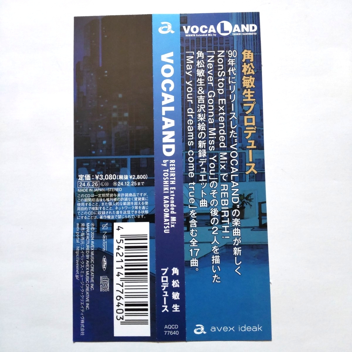 | 商品名稱 : | 角松敏生 VOCALAND『 VOCALAND REBIRTH Extended Mix by TOSHIKI KADOMATSU』(2024) 帯付き 美品 <送料込み> |