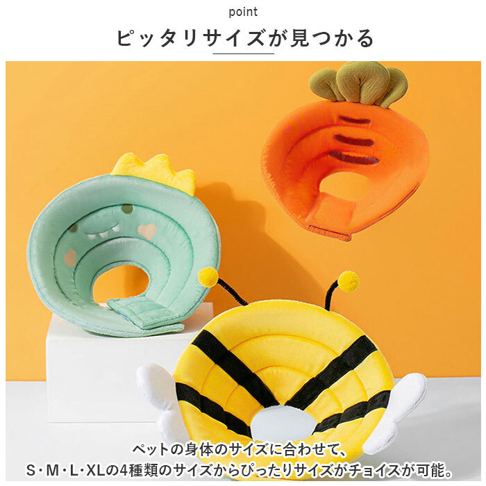 | 商品説明 | ・・やわらか素材がワンちゃん・ネコちゃんに優しい!アニマルデザインが可愛い「ソフトエリザベスカラー」が新登場。 ・【キズ舐め、引っかき防止に】 ・手術後や皮膚疾患の治療中のペットが、患部を舐めてしまったり、噛んでしまうことを防ぐエリザベスカラー。 ・【やわらか素材が優しい】 ・ふかふかのスポンジを布やメッシュでくるんだ柔らかな仕上がりで、首周りが痛くなりにくい!壁や家具などにぶつかったりした時のショックも軽減し、療養中のペットの身体を優しく保護。 ・【ごはんが食べやすいデザイン♪】 ・従来のプラスチック素材のエリザベスカラーに比べて、柔軟性が高く、寝転んだときにもくつろぎやすい素材。お水を飲んだり、フードを食べる時にもストレスフリー。 ・【面ファスナーで装着カンタン】 ・首回りはカラーの付け外しのしやすい面ファスナータイプ。サイズの微調整もワンタッチ! ・【ご家庭でお洗濯OK!】 ・布+スポンジ素材なので、汚れが気になったら、手軽にご家庭で手洗いできるのも嬉しいポイント。 ・【ピッタリサイズが見つかる】 ・ペットの身体のサイズに合わせて、S・M・L・XLの4種類のサイズからぴったりサイズがチョイスが可能。 ・【ほっこりアニマルデザイン】 ・ミツバチの羽根や、ウサギさんのお耳を立体的に表現した愛くるしいルックスで、飼い主さんだけの天使に変身♪(※一部、ニンジンなど動物以外のモチーフデザインがございます。) |