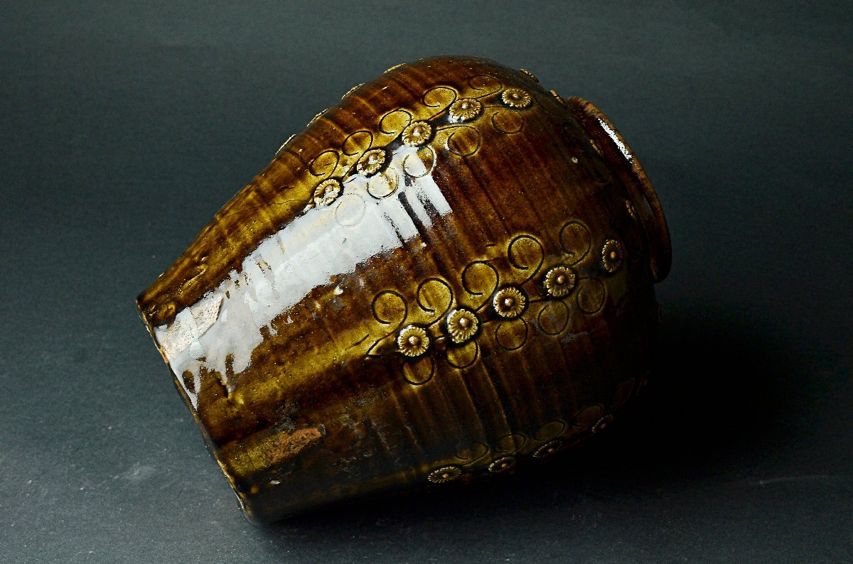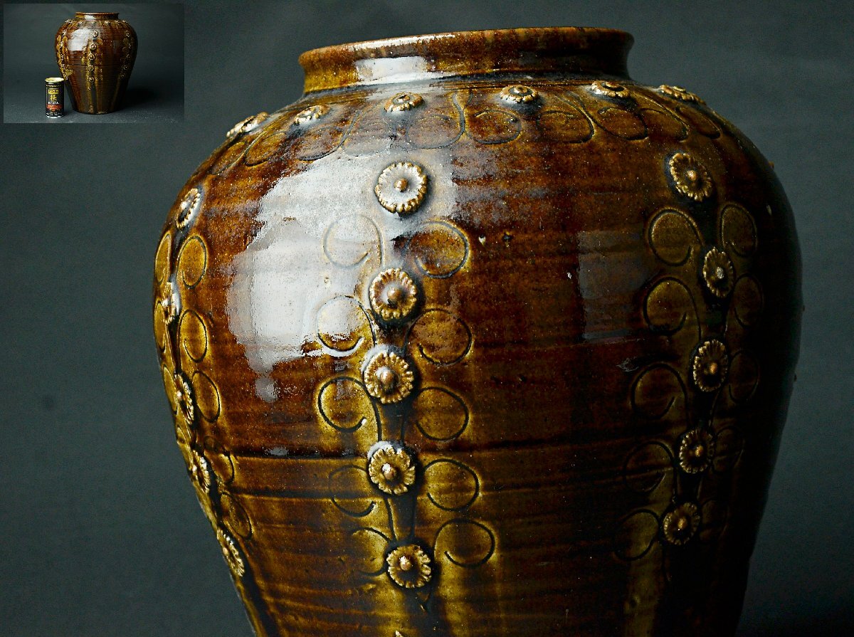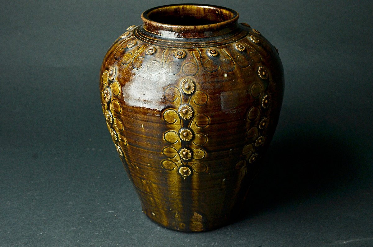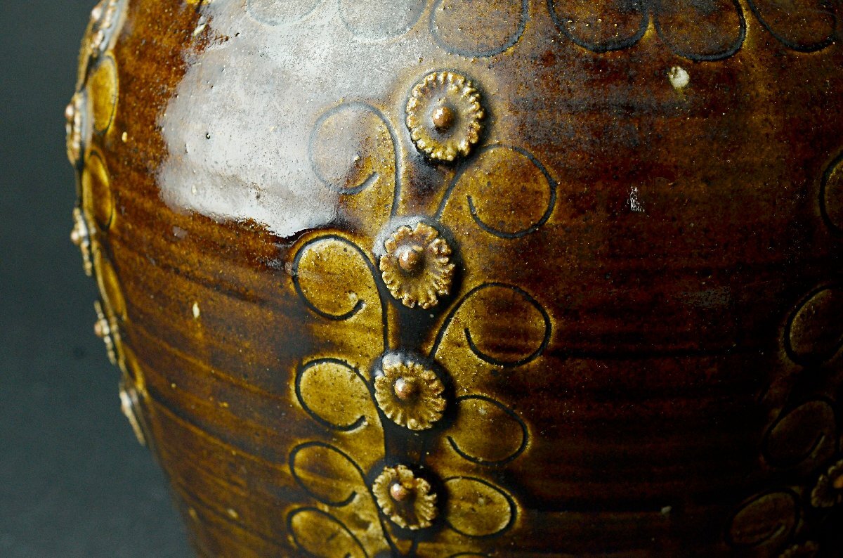 鎌倉時代 古瀬戸鉄釉貼花花紋壺