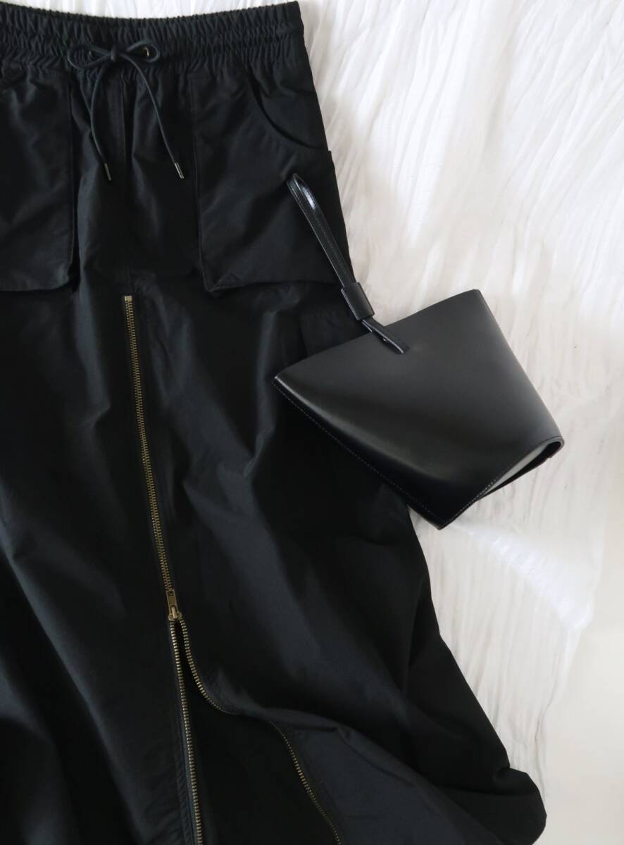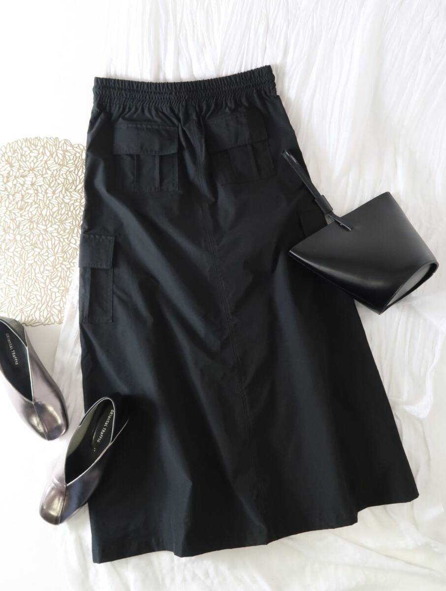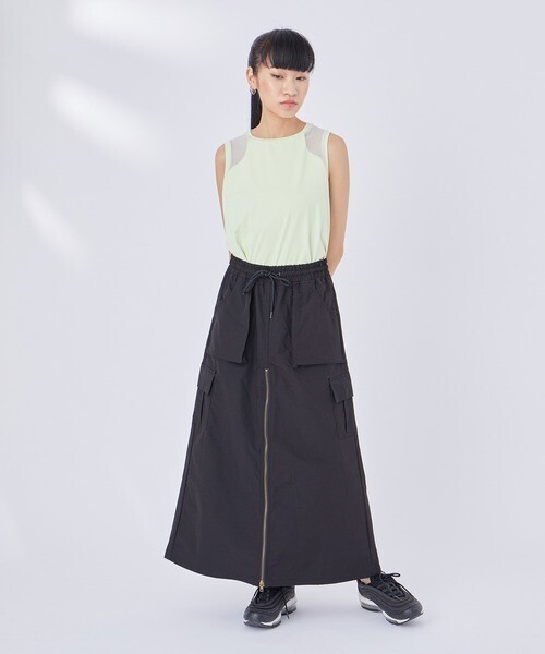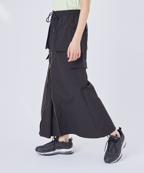 【デザイン・シルエット】 ポケットがたくさんついたミリタリーデザインのスカート。ファスナーでスリット調節可能など遊び心のあるデザインです。リラックス感のあるロングフレアシルエットが、大人カジュアルな雰囲気を演出します。 プリントTシャツと合わせるのはもちろん、シアートップスやトレンドアイテムとのコーディネートもおすすめです。