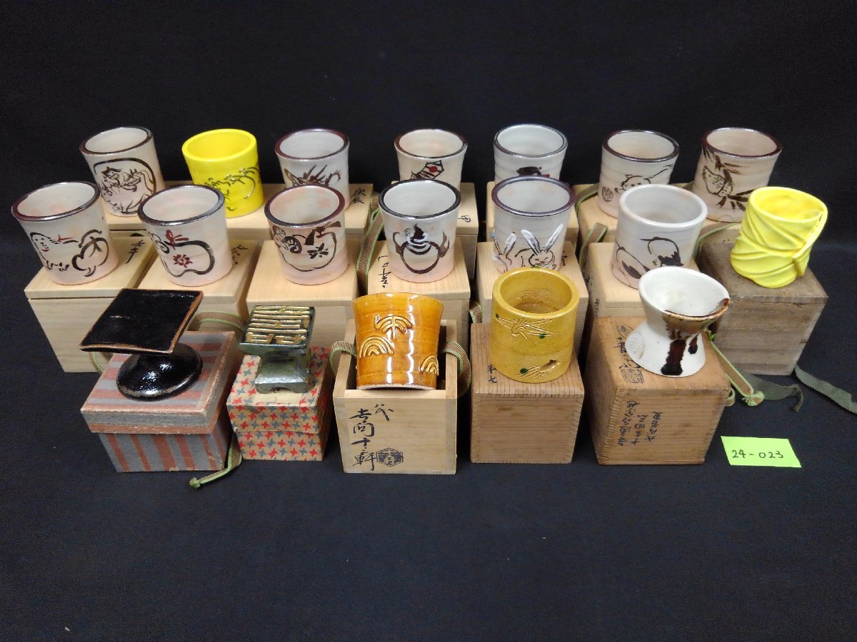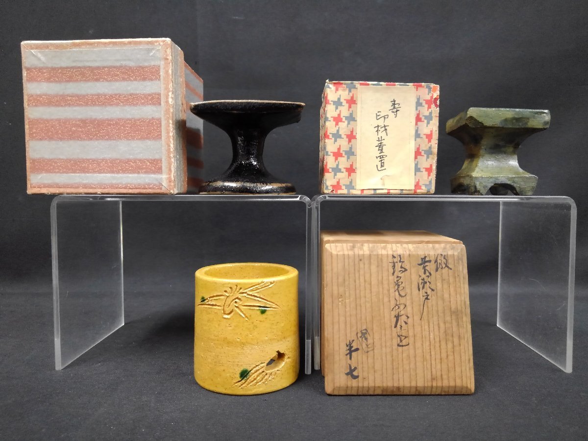 ●★24―023★茶道具 蓋置 大量まとめ 香斎/印材蓋置/半七 黄瀬戸 鶴亀ふた置/八代 吉向十三軒 干支 陶器 共箱 在銘 落款 古美術[100]