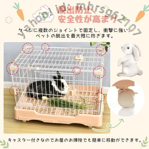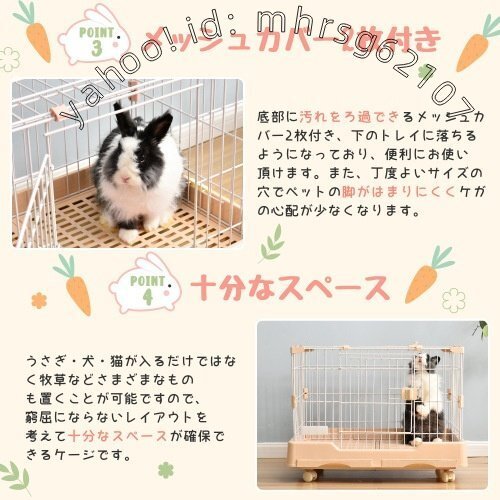 【お世話しやすいドア付き】 屋根面にドア付きので、お世話がしやすくてペットと触れ合うことも簡単になりなす。ペットが中に入れたままでも掃除などの作業がスムーズに進みます。また、正面のワイド扉も付き、おもちゃやお世話用アイテムの出し入れ簡単です! 【お手入れ簡単】軽くてコンパクトなトイーは1枚1枚、すぐにお取りいただけますので、ペット用シーツ等を敷いて頂けますと、簡単にいつも清潔さが保てます。 【メッシュカバー2枚付き】 底部に汚れをろ過できるメッシュカバー2枚付き、下のトレイに落ちるようになっており、便利にお使い頂けます。また、丁度よいサイズの穴でペットの脚がはまりにくくケガの心配が少なくなります。 【十分なスペース】うさぎ・犬・猫が入るだけではなく牧草などさまざまなものも置くことが可能ですので、窮屈にならないレイアウトを考えて十分なスペースが確保できるケージです。 【脱出防止、安全性が高まり】ケージに複数のジョイントで固定し、衝撃に強い、ペットの脱出を最大限に防ぎます。
