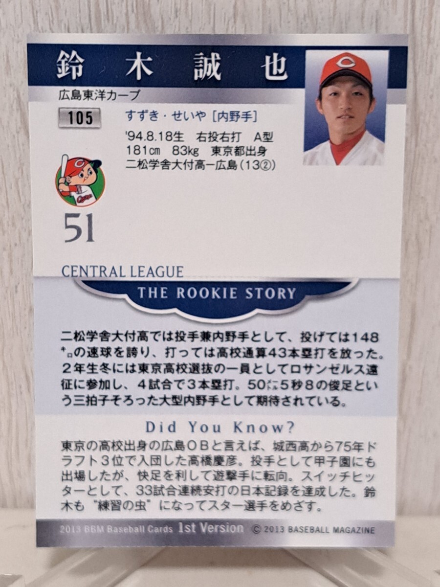 | 商品名稱 : | 2013BBM1st 鈴木誠也 ルーキー RC 広島カープ NO105 |