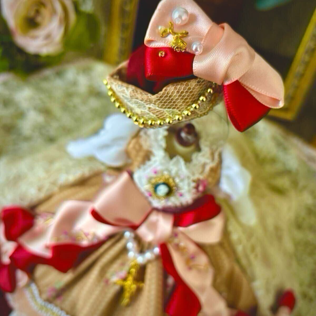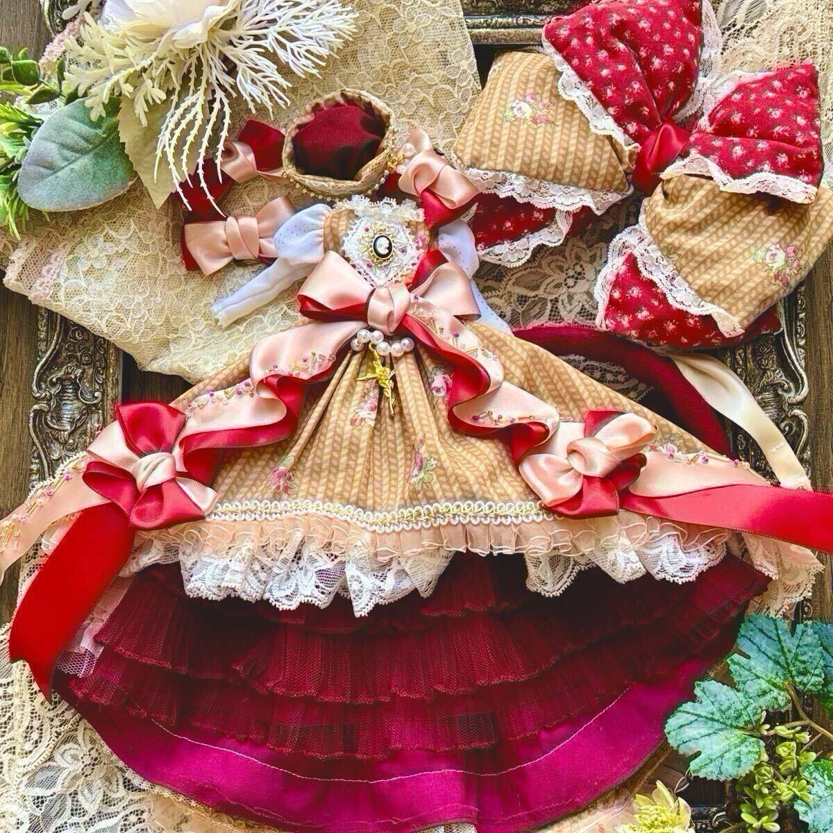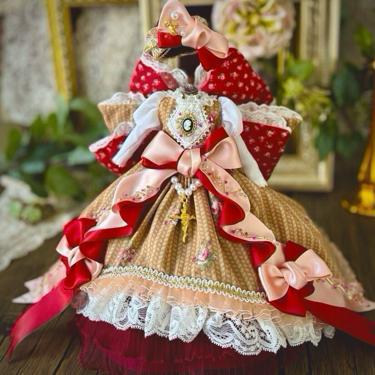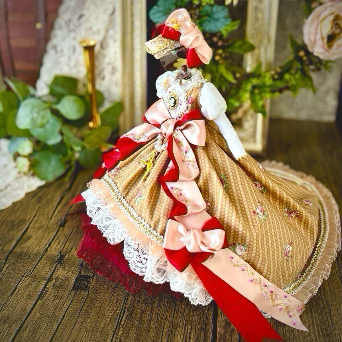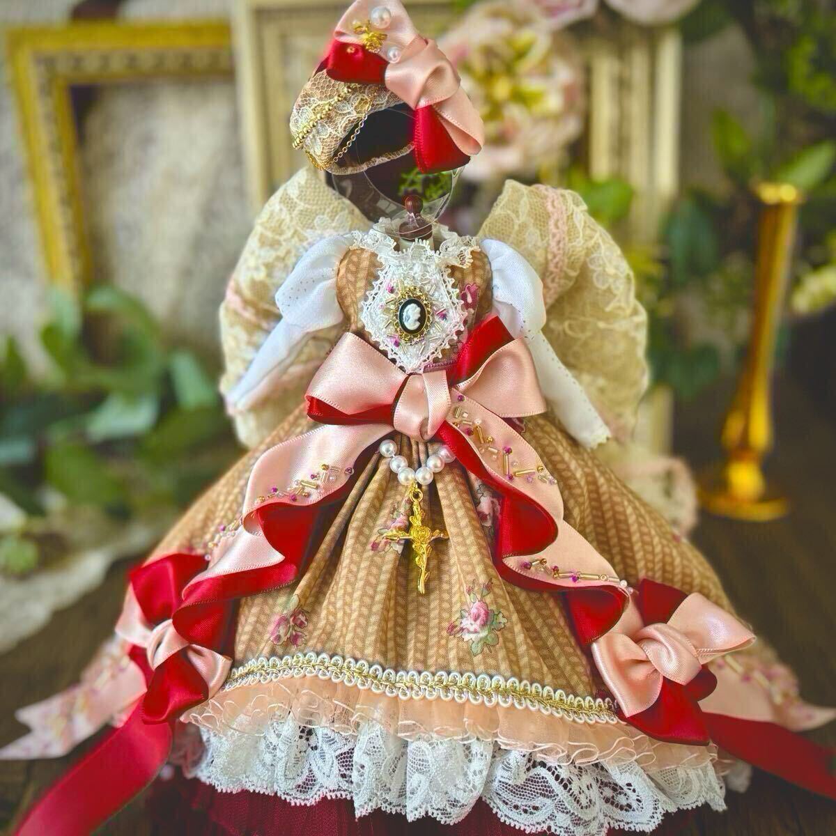 ご覧いただき、ありがとうございます。 こちらは、27cmドールサイズ ミニチュア衣装セット 『古きと今を繋ぐロングトレーンドレス』です。 布地が貴重な時代に、大事に大事におしゃれを愛でる旧世の女性の感性に、私の今を繋げたいと想い製作しました。 スカート部分には優雅な曲線美を、パフスリーブには愛らしいふんわり感が出せるようパターンから製作しています。お袖は凛とした風合いも残したかったので、27cmドールの腕がギリギリ通るくらいのサイズまでタイトに製作しています。 付属品がたくさんございます。お手に取ってくださった方に新しい着こなしをデザインして頂けたら嬉しいです。 【セット内容】 ◎ドレス本体(背中側半開スナップボタン) ◎帽子 ◎帽子用リボン(安全ピン) ◎ヴェール(取り付け器具なしでも綺麗にかざれますが、付属の安全ピンつきリボンで飾っても可愛らしいです) ◎ヴェールを大きなリボンにするための留めリボン(安全ピン) ◎赤×ベージュのおおきなふわふわリボン(安全ピン) ◎アンダースカート(スナップボタン) 前後でレースの色が異なります サイドで留める形状です ◎飾りリボン×2(安全ピン) ◎フェルトでつくったクリノリン 輪っか状にしてサイズを調整してください ※上記以外のトルソーやお人形本体、や背景その他小物などは付属しません。 【商品の状態】 ハンドメイド品になりますので、未使用に近いを選択しています。完璧を求める方のご購入はお控え下さい。 【ドール向けのご使用について】 身長約27cmの小さなヘッドのお人形で着用確認しておりますが、全ての種類のドールで着用可能とは限りません。ご理解の上ご入札をお願い致します。 【商品のクオリティについて】 素人のハンドメイドです。見返しはありますが、裏地はつけておりません。歪みやほつれ、二度縫いなど至らない点もございます。ミシンと手縫いの他、必要に応じて接着剤やほつれ止めを使用しており、お洗濯はできません。少々きつかったり緩かったり左右非対称や二度縫い等至らない点多々ございます。ご理解頂ける方のみご入札お願い致します。お人形やトルソーへのお色移りには十分にご注意ください。小さな部品を含んでおりますので、お子様やペット等のの誤飲にも十分にお気を付けください。 【その他注意事項】 発送時は、ラッピングしたものを宅配用ビニール袋に入れて発送いたします。 落札後のキャンセルはお受けできません。また、ご入札の取り消しなども対応しておりません。十分にご納得頂いた上でのご入札をお願いいたします。ご不明な点は必ず入札前にご質問をお願い致します。 オークション終了後24時間以内にご連絡需在賣家要求時間完成匯款 (お取引の開始)と72時間以内の入金をお願いいたします。 直接のお取引・即決には対応しておりません。 お取引の中で強い不安や不快感を感じた場合、キャンセルさせて頂くことがございます。 発送等で発生するトラブルへの対応はお受け致しかねます。ノークレームノーリターンでお願い致します。 自宅にペット、喫煙者はおりません。 *:゜+。.☆.+*:゜*:゜+。.☆.+*:゜*:゜ 最後までお読み頂きありがとうございます。 上記ご理解頂けるようでしたら、ご入札よろしくお願い致しますm(_ _)m >
