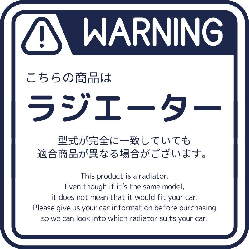 | 取り付けについて | ラジエーター交換の際は、下記部品の同時交換をお勧めします。 ■ラジエーターキャップ ■ホース・ホースバンド(ホースバンドはねじ込み式を推奨) ※劣化が原因でクーラント漏れ等のトラブルとなります。 | ||||
