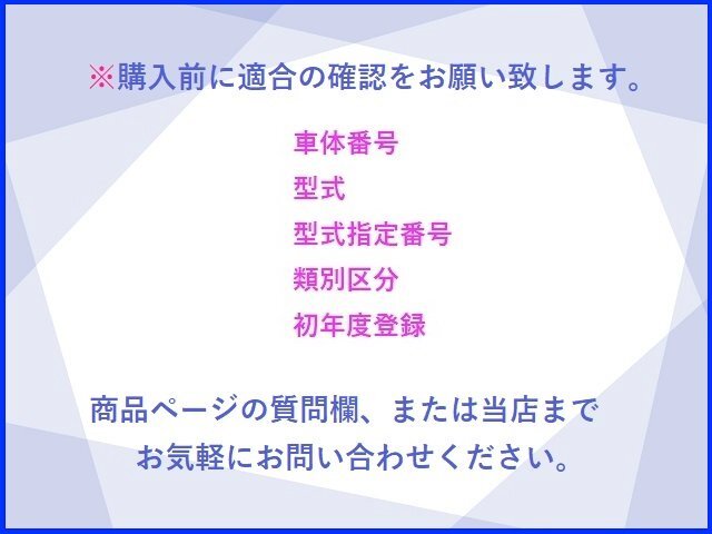 | 適合・問合せ | 同一車種でも異なる品番・商品を使用している場合がございます。 *車検証記載の車台番号(アルファベットを含む全桁) *型式指定番号類別区分番号 をご連絡下さい。 TEL:0263-40-2100 Mail:yahoo@artparts.net 車種の適合はお問い合わせフォーム または商品ページの質問欄 からもお気軽にお問い合わせください。 |