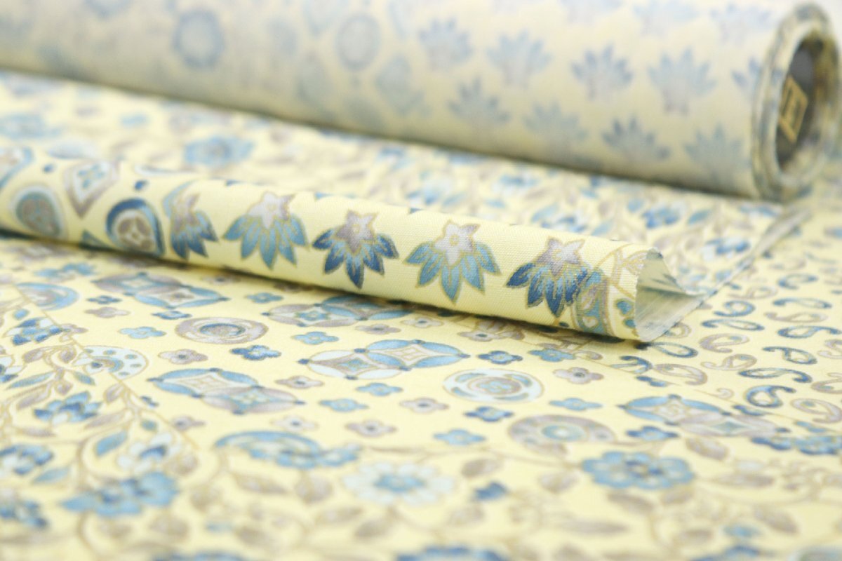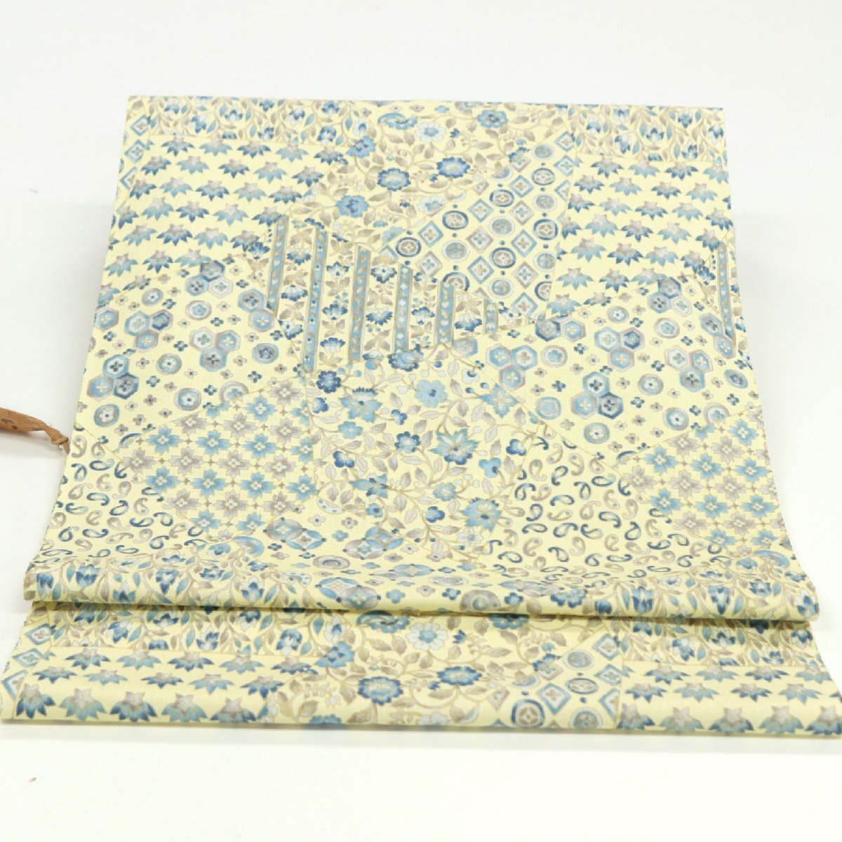 全体には、グレー、薄グレー、ライトブルー、紺色のお色目で、裂取更紗が染められております。