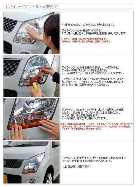 バットベリー アイラインフィルム 出品タイトルの車種別形状にカットしたフィルムです。 フィルムカラーは、落札後に、お問合せ等でご連絡ください (カラーは2枚目画像のカラーサンプルを参照ください。) 付属品:貼付け説明書 数量「1」で左右1セットです。 「送料無料」にてメール便で発送いたします。 【注意】メール便はお届け日時指定、時間指定はできませんのでご了承ください ______________________________________ 『BATBERRYアイラインフィルム』です! ヘッドライトの上から貼り付けるだけで簡単にドレスアップできます♪ フィルムは非常に透明度が高く深みのあるフィルムを厳選しております。 完全接着すると高圧洗車機等では剥がれることがございません! 説明書ではフィルムの貼付け方向を図解しており、綺麗に貼るコツも説明してます。 発送時にはフィルムが折れないように板ダンボールを同封しております。 ______________________________________ |