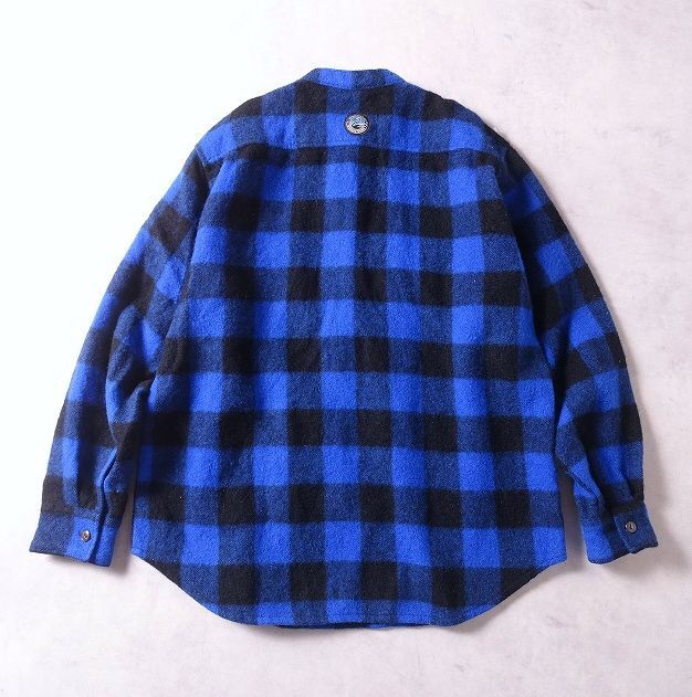 ウール100% 長袖 バッファローチェック ワッペン バンドカラー ポケット付き プルオーバー シャツ