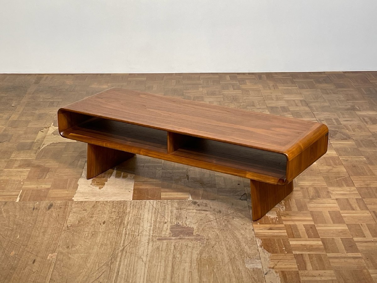 みずみずしいなめらかな杢目の表れたブランドの誇る最高品質ウォールナット材を無垢材で配し、まろやかさとシャープさを具有させたエッジデザインで飾ったミニマムモダンローボード。Karimokuより。
