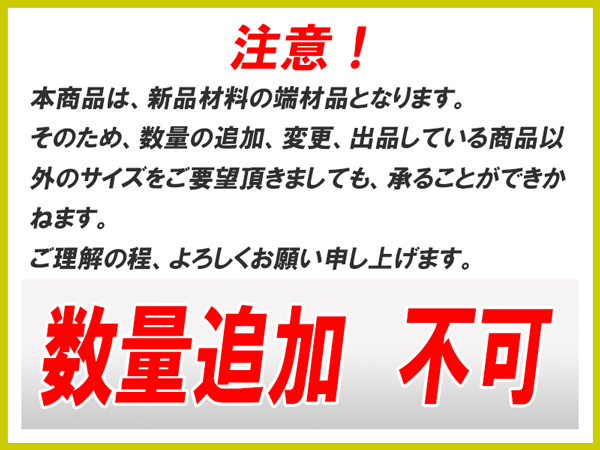 注意事項 お取引方法について 落札後の連絡等は取引ナビとなりますが、ヤフオク!取引ナビ使い方ガイドより、こちらからのお礼等のご連絡は行なっておりません。 落札後は取引に必要な情報をお送りください。 取引に必要な情報を確認後、送料をご連絡させていただきます。営業日について 土日祝日は休業となります。 長期休暇の場合は、自己紹介の欄にてご連絡させていただきます。 休業日の電話・メール対応、配送業務等は行っておりません。 翌営業日からのご対応となりますのでご了承ください。 商品について 商品サイズ・寸法はすべてmm単位となります。 端材となりますので、精度の細かい寸法をご希望の方はご遠慮願います。 バリ取り済みですが、取扱には十分ご注意ください。 タイトルにある記載寸法は、±5mm程の寸法誤差がありますのでご了承ください。 撮影、画像処理には十分注意しておりますが、撮影時の光の反射具合などにより色彩に違いがでますこと、また、お客様のPC環境等で画面の見え方など実物と若干違うことがあります。予めご了承下さい。 板厚・サイズ、ご使用方法によっては反り・歪みが出る場合もございます。キャンセル・入札取り消しについて お支払い後のキャンセル・商品発送後の返品・返金は一切できません。よくご確認のうえ入札ください。 落札後、1週間経ってもご連絡・ご入金頂けない場合は落札者都合によりキャンセルとみなします。ご質問ついて 出品終了前日(前々日)にご質問を頂いた場合、回答が出来ない場合がございます。 出品終了後のご質問回答は行えませんので、再度(再出品後、または別の商品から)ご質問ください。 本ページ内で確認できる内容のご質問には回答しない場合がございます。評価について 当店では、お客様より『評価』を頂いた場合のみ、『評価』をお返しする形式を取っております。 お客さまより評価を頂かなかった場合は、当店から評価をさせて頂くことはございません。 評価がご不要な場合は、恐れ入りますが、当方への評価をお控え頂きますようお願い致します。 何卒ご了承くださいませ。領収書について 領収書が必要な場合は、取引ナビより要領収書の旨(宛名・但し書きの内容も添えてください)をご入力ください。 電子文書にてお送りさせて頂きますので、別途メールアドレスをご連絡ください。 取引ナビに記載が無い場合領収書の発行ができませんので、ご了承ください。 また、領収証の再発行はできませんのでご注意ください。返品・交換について 返品・交換につきましては、商品受取後、7日以内にご連絡ください。 お客様の都合による返品、交換は一切お受けできません。 弊社のご返品の了解なく商品をご返送いただいた場合は、受け取りを辞退させていただきますので、ご注意下さい。 配送中の破損、ご注文の品と異なった場合、加工間違いなどの場合には速やかにご対応いたします。 送料は弊社負担とさせて頂きますので、着払いにて商品を送り返出售的商品有可能是要交換商品,並不是單純販售,請確認頁面後在做出價。 してください。 原則としてお客様都合による返品はお受けできませんので、予めご了承下さい。 返品に関しましては、以下【返品の条件】をご確認下さい。返品の条件 以下の場合のみ返品をお受け致します。 ・不良品の場合 ・配送中の破損の場合 ・注文した商品と異なる品が届いた場合 その他、以下のような商品の返品についてはお受けできません。 ・到着後7日以上経過した商品 ・お客様の過失により破損した商品 ・使用された商品 ・セール対象、サービス商品 返品にかかる送料負担の有無 返品にかかる送料については当社負担とさせて頂きますので、着払いにてお送り下さい。