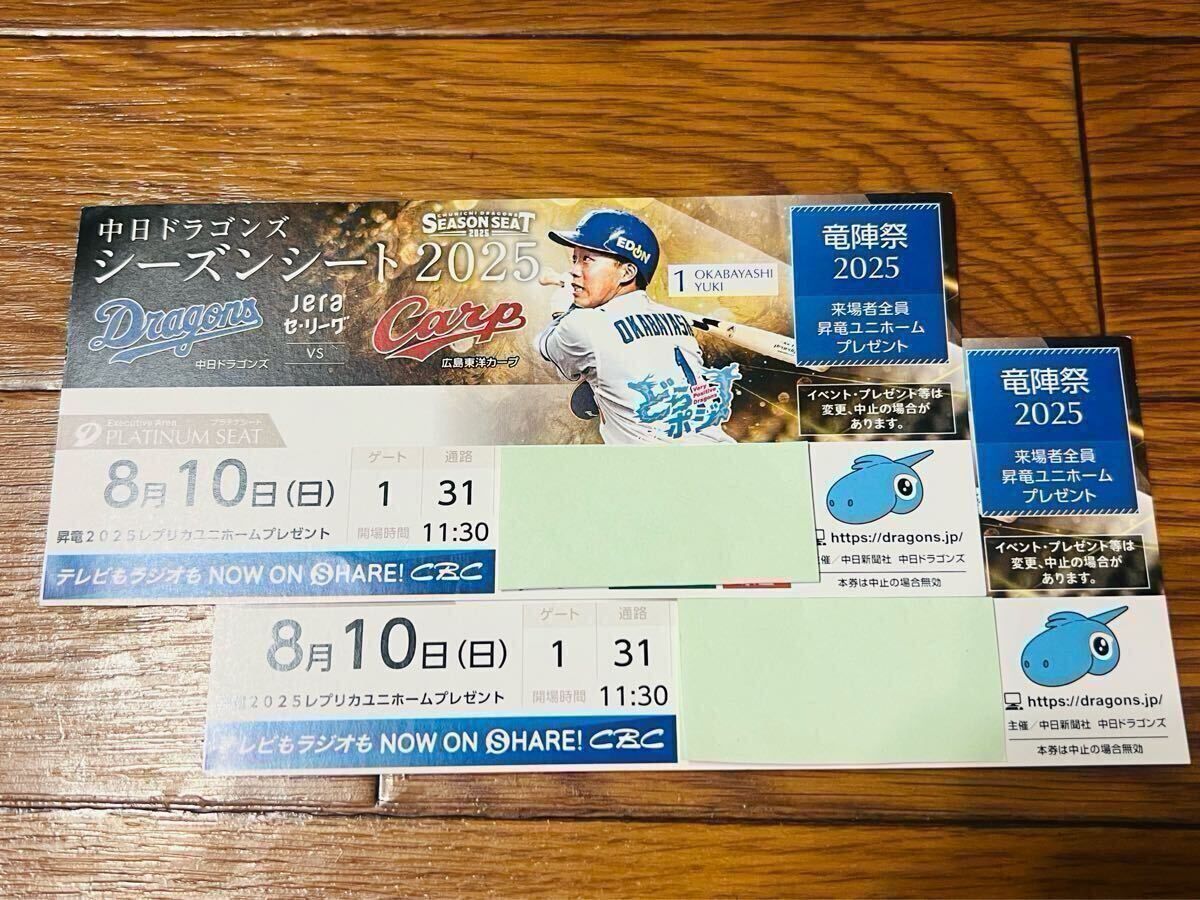 8月10日(日) 中日ドラゴンズvs広島東洋カープ バンテリンドームナゴヤ 11:30会場 13:30試合開始 プラチナシート(バックネット裏) 1ゲート 3塁側 20-24列の間 11番~30番 連番ペア 【昇竜ユニホーム配布日です】 2枚ペア価格となります。連番席です。 定価11,000円(1枚当たり)/メンバーズ価格 >転売目的賣家頁面可有標示無法與代理業者交易,請先確認頁面或與服務人員聯繫,無法交易的情況得標也會直接被賣家刪除,請確認後在做出價。 では無いため、定価以下開始とします。 プラチナシートは14-16列程度の間が最前列となる為、 実質前から6列目-10列目程度の範囲となります。 決済方法はかんたん決済となります。 評価内容が良くない方はご入札をご遠慮願います。 ノークレームノーリターンでお願いします。 不明点はご質問ください。 試合観戦を楽しみにしてましたが、 都合により行けない為、出品させて頂きます。 楽しんでくださる方に落札頂ければと思います。(2025年 7月 30日 0時 32分 追加) ご質問が多い項目について、以下ご回答いたします。 ※開催中止時について 開催中止時の補償は一切ございません。 返金、交換、振替開催チケットへの交換などは対応を致しかねてしまいます。後日の問い合わせもお受けできません。 ご理解の頂ける方のみご入札をお願いします。 ※配送について 配送方法はゆうパック(おてがる配送)にて対応いたします。 配送補償が付帯されており、対面配送となりますので、安心してお取引頂けるかと存じます。なお配送料は当方にてご負担をいたします。 >