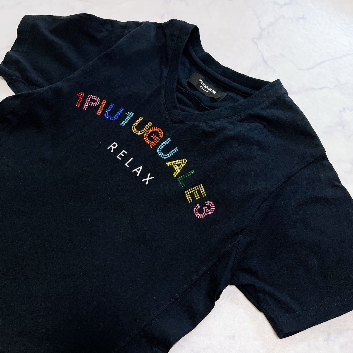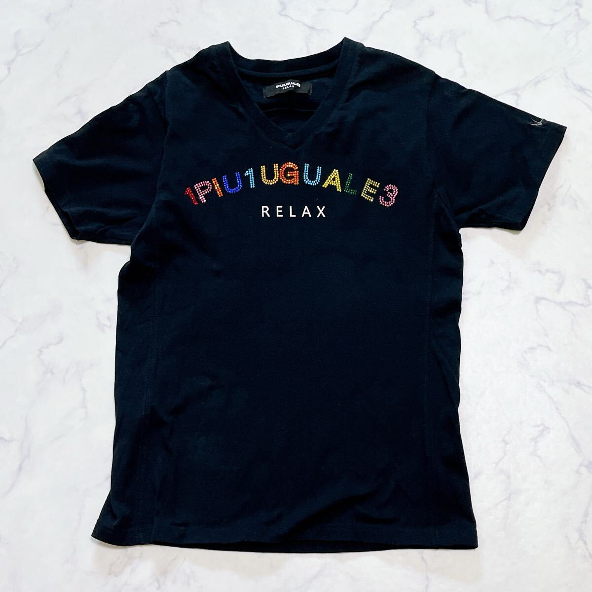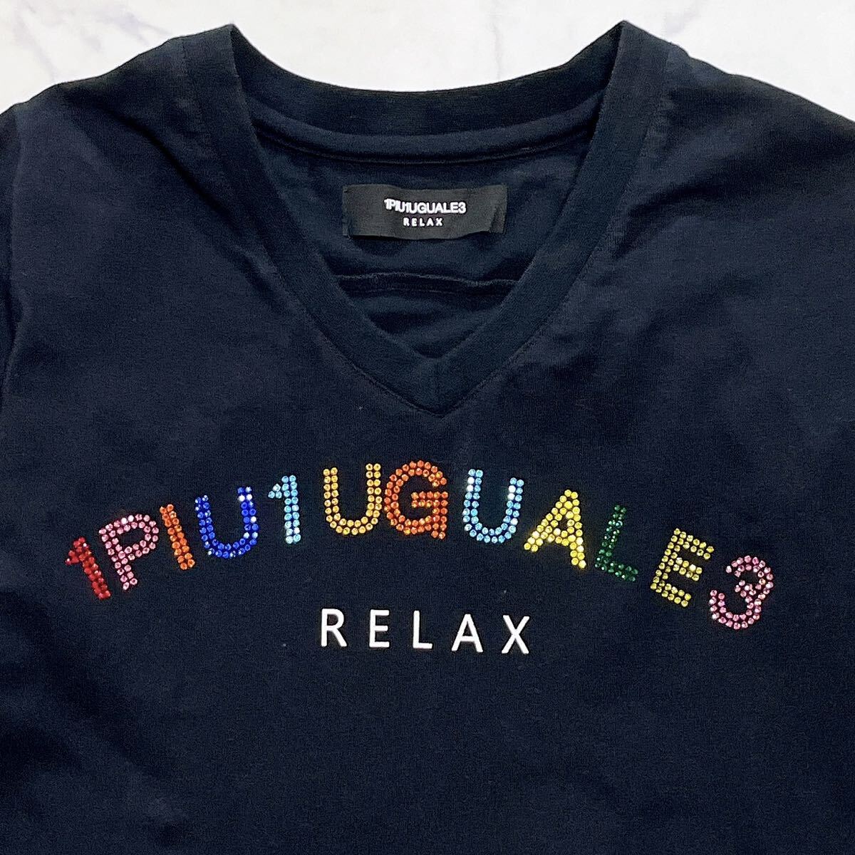 美品 1PIU1UGUALE3 RELAX ウノピュウノウグァーレトレ ラインストーンロゴ半袖Tシャツ洗えるメンズSレディースMユニセックス