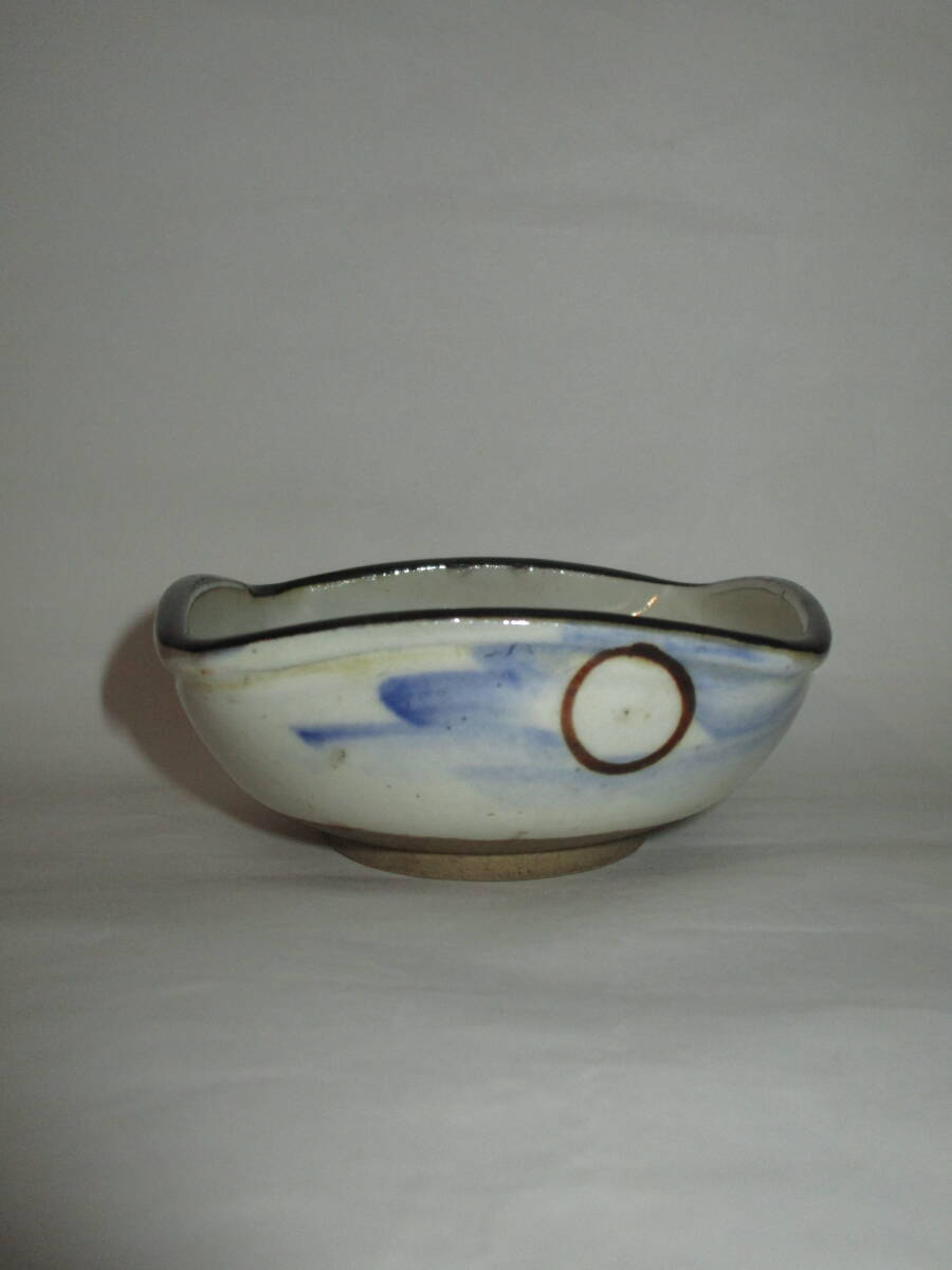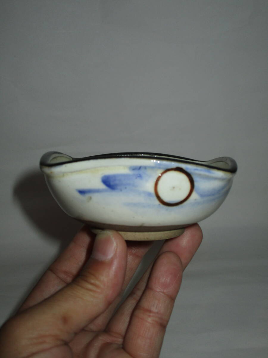 【明治期頃】瀬戸焼 絵瀬戸 日の丸・帆船紋 四方型 小鉢 1客 (幅9.3㎝) ●酒盃にも● ●無傷●