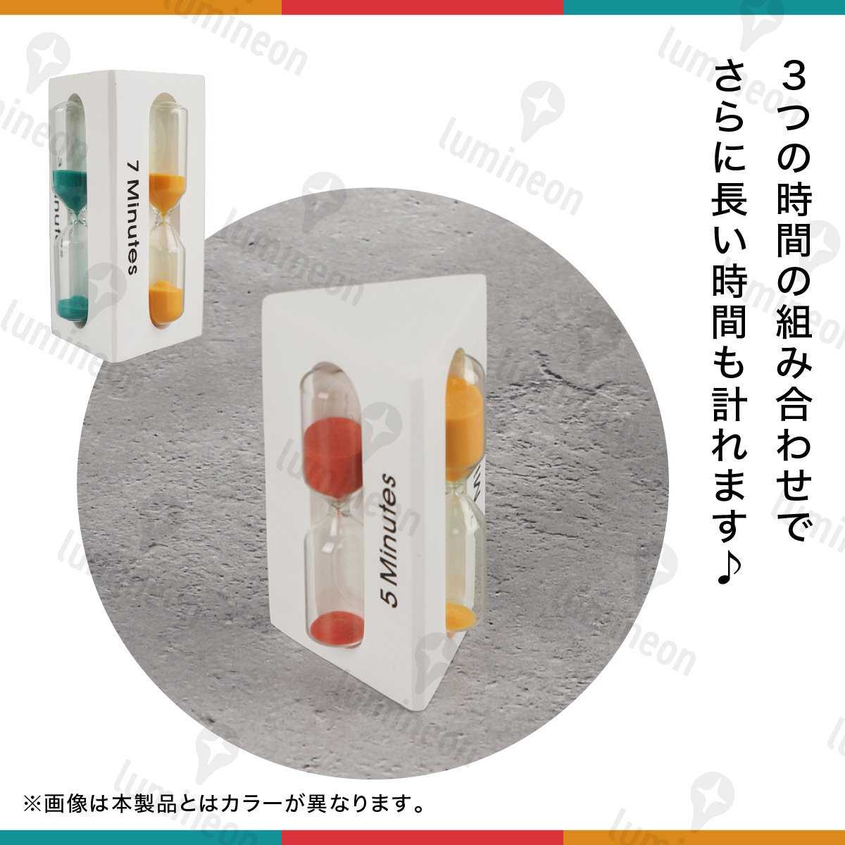 3つの時間が計れるおしゃれな三角の砂時計。 鮮やかな3色の砂が白く塗られた木とやさしくマッチ。 タイマーとして使うのはもちろん、眺めて癒されるのも◎ 時間の組み合わせ方で3分・5分・7分以外にも 色々な時間が計れます。 インテリアオブジェとして飾るのもオススメ♪