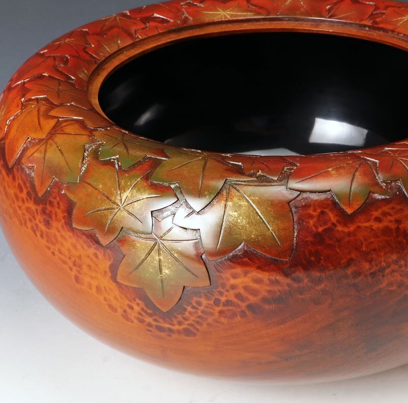 紅葉の絵柄を讃岐彫りで彫刻した美しい木彫りの水指です。 ★商品は篠原傑の作品である事を保証致します。 |