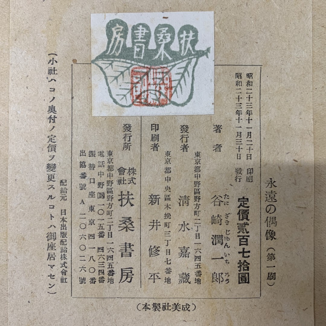 | 商品名稱 : | ●01)【1点限り!】【1円〜】永遠の偶像/谷崎潤一郎/扶桑書房/昭和23年発行/A |