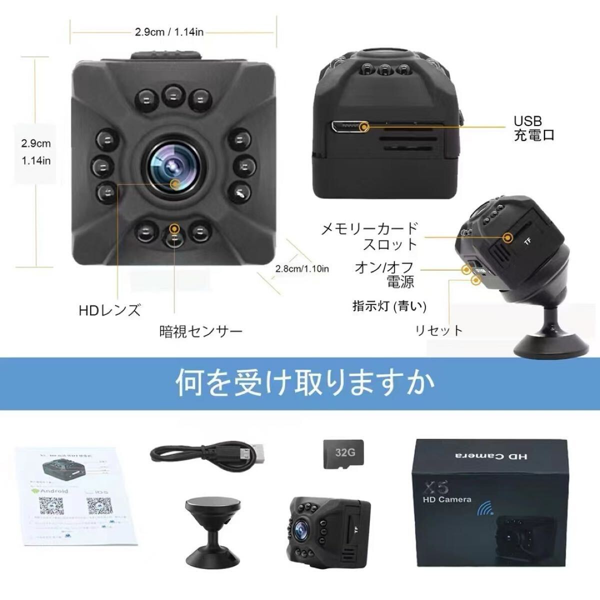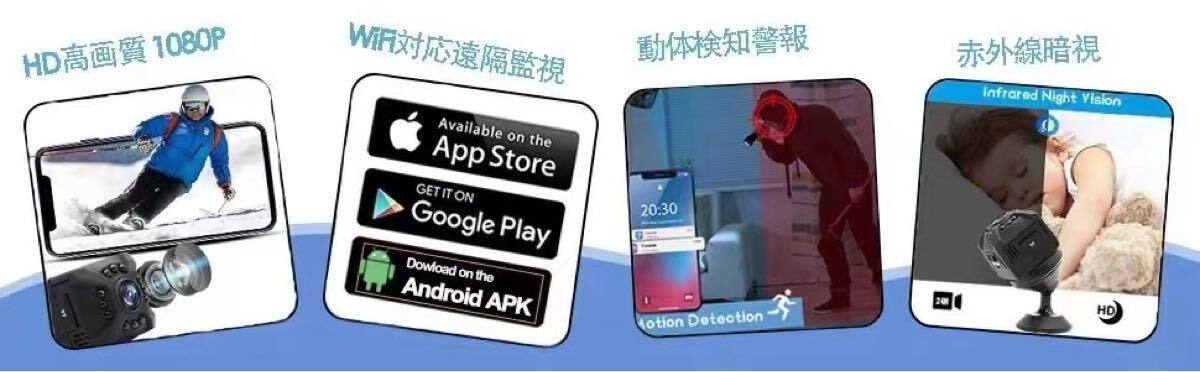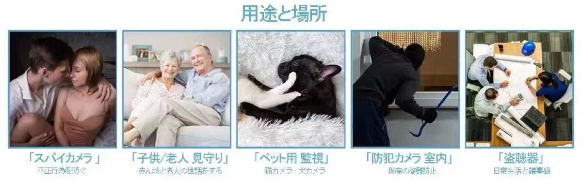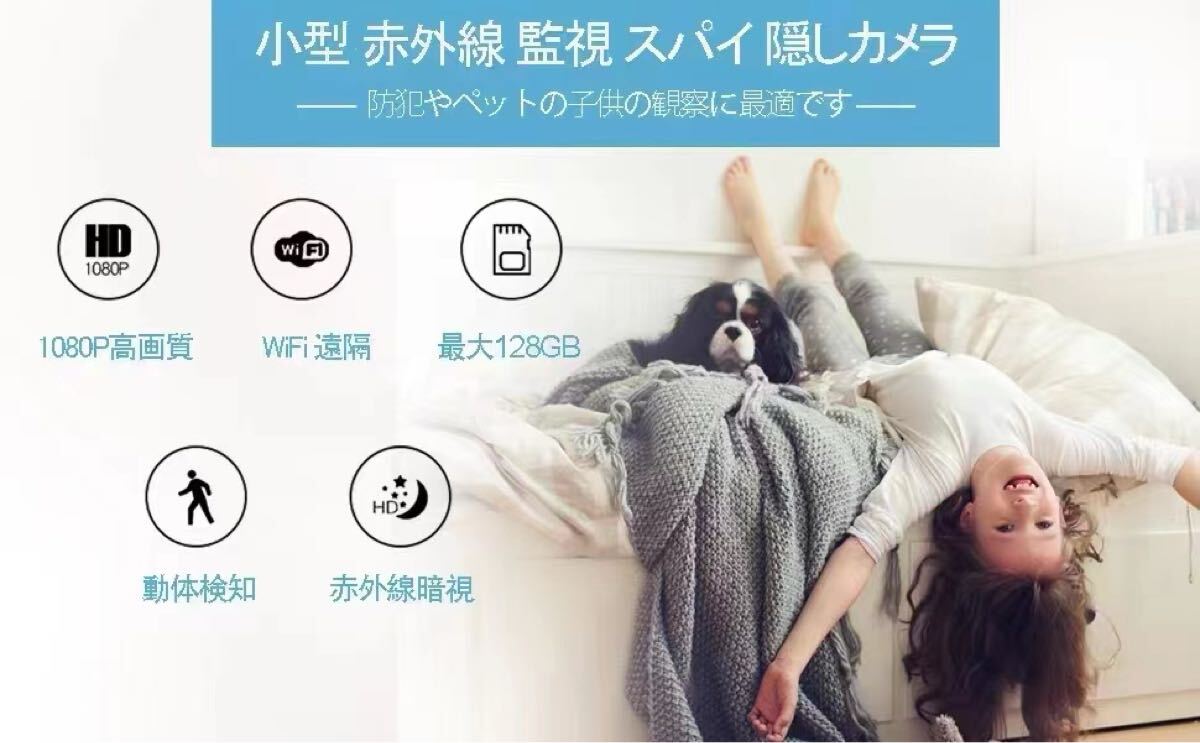 【超小型カメラ】本体が軽く、操作簡単、取り付けしやすい。小型カメラは、どこにでも隠せるので、家庭用防犯カメラ・子供老人見守りカメラ・ペットカメラとして、違和感はなくに録画できます。誰もこのワイヤレスルームカメラに気付かないでしょう。収納スペースも取りません。 お宅、事務所、倉庫、店舗などへの設置に向いています。犯罪防止のために居間設置、一人暮らし、家の内部を監視して自分や財産を守るために設置、赤ちゃんやお年寄りの世話をしたりするために部屋に設置されています、出張時のペットの見守り用に。 【1080P画質・155°広角】360回転スタンド内蔵の隠しカメラ、1080PフルHDビデオ解像度、155度の広角レンズを備えた、今までにない圧倒的にキレイな動画撮影を実現しました。 昼夜を問わず、鮮明な動画撮影や詳細な表情画像撮影に捕獲します。屋内と屋外で起こっているすべてのことをより広い範囲で見ることができます。 オーディオと連続再生によるビデオ録画をサポートします。 どこにいても、ミニWi-FiカメラがWiFiに接続した後、電話アプリで自宅/オフィス/車を確認してください。 【WIFI遠隔監視 iOS/Android対応】監視カメラはWiFi(2.4GHZのみ)に接続されており、外出先でも専用アプリを通じて、スマホで遠隔監視可能。ペットや赤ちゃんが家で何をしているのか、あるいはあなたが家を出るときに見知らぬ人が家に入るのかどうか知りたいですか?心配する必要はありません、いつでもどこでも、リアルタイムで自宅を見ることができます。無料アプリ。重要なライブビデオ画面をキャプチャします。 レコーディングと撮影のSDレコード。 距離制限なし、あなたとあなたの家族を24時間年中無休で保護するためにwifiセキュリティカメラを接続するのは簡単です! 空き巣の盗難対策やペットの見守りに適します。 【動体検知 警報 光のない赤外線暗視】潜在的に危険な移動は見逃さない。撮影範囲内で動きが検出されると、赤外線カメラはすぐに画像付きのアラーム通知を携帯電話にプッシュします。 暗視では暗視が自動的にオンになり、録画時に赤外線が見えなくなります。画質が良くて、暗い場所見える 【パッケージ内容:wifi防犯カメラ本体*1、USBケーブル*1、360回転スタンド*1、日本語取扱説明書*1。 >