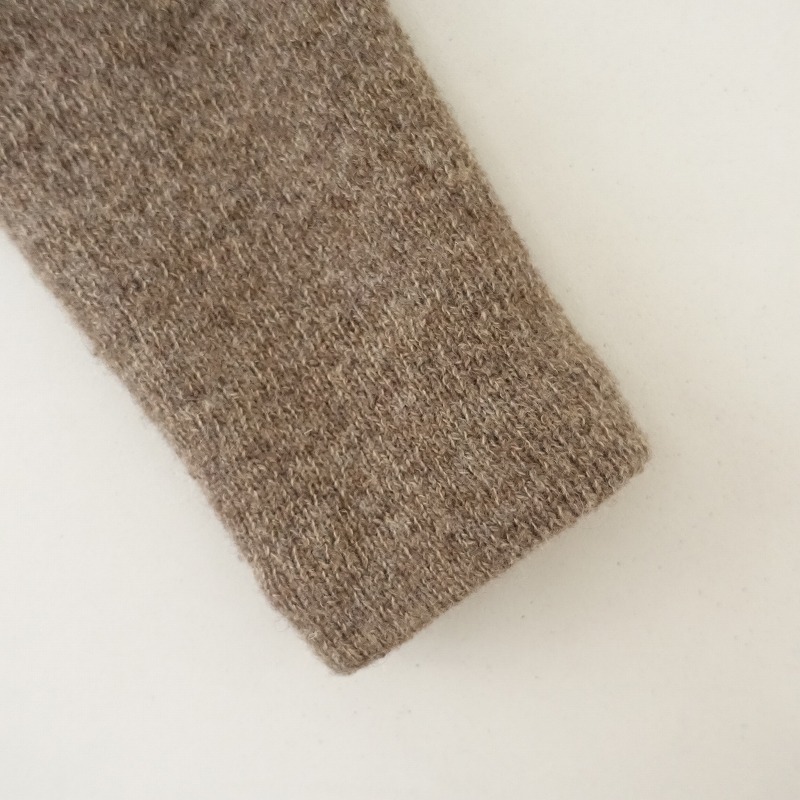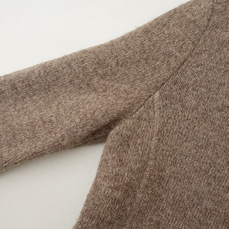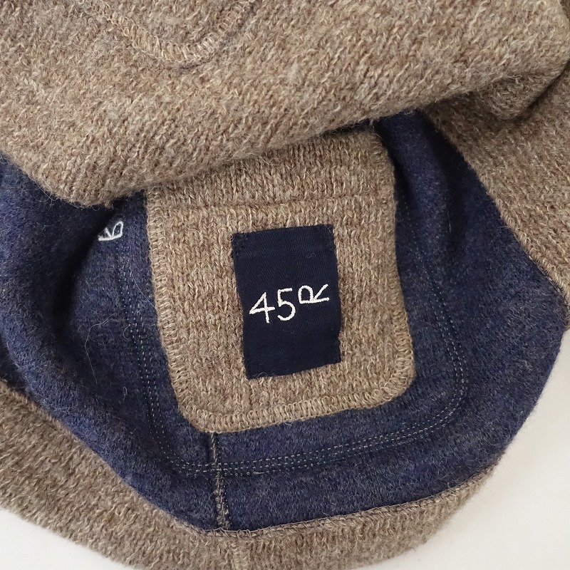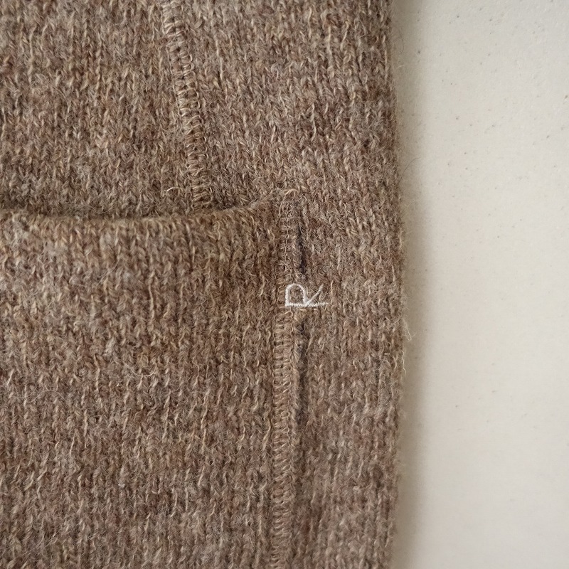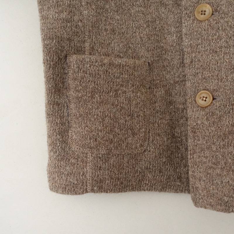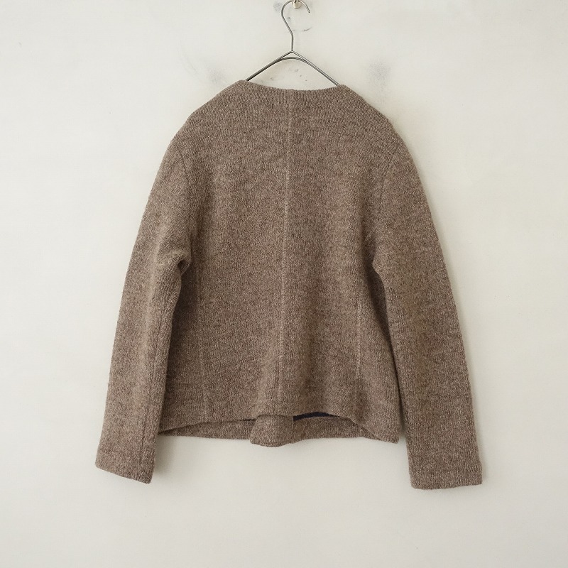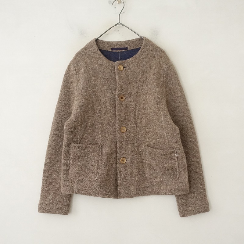 | R45RPMのウールニットノーカラージャケットです。カラーはブラウン系ミックスでm裏面ネイビーの中厚手のニット地で仕立てられております。フロントボタン開閉で着脱でき、両裾にパッチポケット、内ポケットが1つ付いております。左腰に「R」のブランドロゴ刺繍があしらわれております。 |