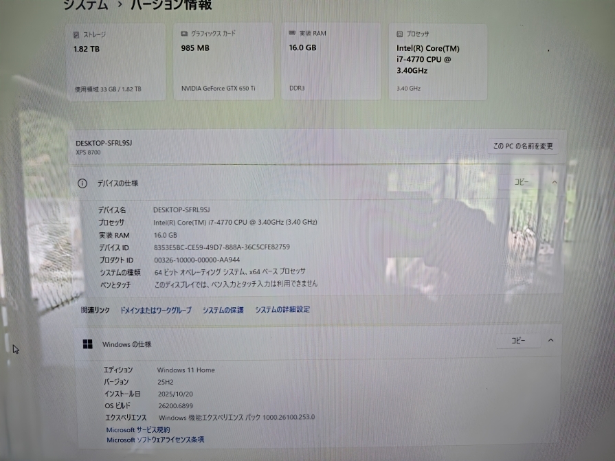 DELL XPS8700 Core i7-4770 <Win11-Home 25H2> 24インチDELL純正モニター付