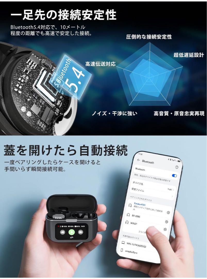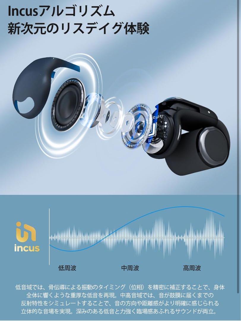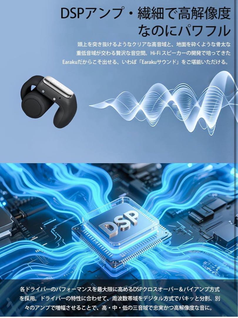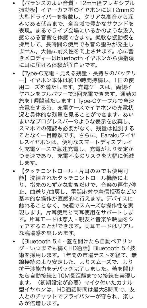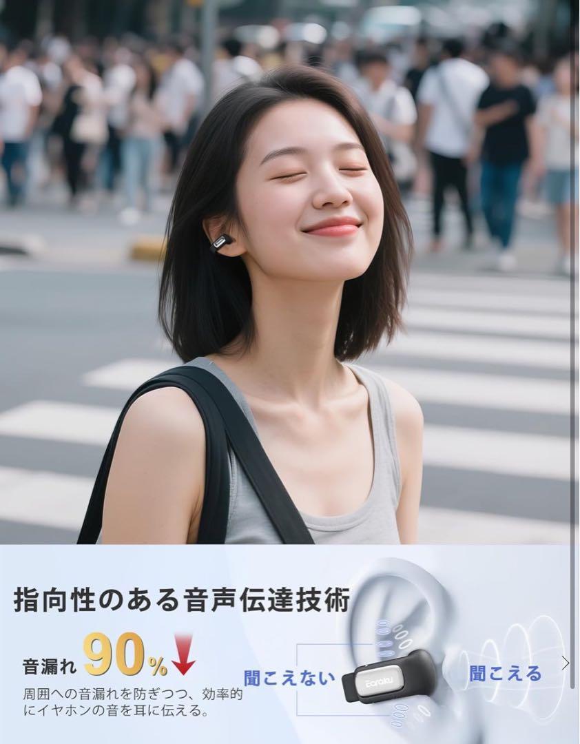 【Earaku独自Incusアルゴリズム技術・驚異的なオーディオ体験】「Aircuff」OWSイヤホンが採用したIncusアルゴリズム技術は、実際の音源や出力音圧に応じて、自動的に高音域・中音域・低音域の出力レベルを調整し、3つの周波数帯のバランスを最適化。常に快適で臨場感あふれるリスニング体験を実現。 【DSPアンプ機能・音漏れ防止設計】DSP アンプはサウンドのバランスを最適化し、イヤホン出力の低音域、中音域、高音域のバランスをより良くし、デジタル信号処理を通じてイヤホンのノイズを除去します。音楽の細かなニュアンスや楽器の音色がより鮮明に伝わり、没入感のある音楽体験が得られます。スピーカーにより空気圧の調節やサウンドキャビティで、音漏れを効果的に抑制しています。オープンイヤーながらユーザーのプライバシーを守り、パーソナル空間を作り出し、没入感のあるHi-Fiサウンドをそのまま楽しめます。 【多機能タッチディスプレイ付き・10種類の音楽機能】イヤホン-2025年革新的、独創性豊かなデザイン!タッチディスプレイ搭載している充電ケースは、携帯電話を取り出す頻度さえ減らしてくれます。携帯電話よりもコンパクトで、よりも音楽機能に特化する同時、携帯電話の操作による消費電力の問題を軽減することができます。音楽プレーヤー、イコライザー切り替え、すべてが音質と音響効果の追求にEarakuワイヤレスイヤホンを反映しています。イヤホンを探す機能、タイマー機能、カメラコントローラーなど機能により、充電ケースに新たな役割を与えます。新しい機能と革新的なデザインを追求すること、これこそが皆様にお届けしたいユニークな体験です! 【軽量な装着感・IPX5防水仕様】イヤホン単体の重量はわずか5.8g、総重量はただ53gで、ほぼ卵1個分の重さと大きさで、外出時の持ち運びにとても便利です。IPX5の防水機能を備えたOWSイヤホンは、日常的な雨や汗に対して耐性を持ちます。これにより、ランニングやアウトドアでの活動など、湿度の高い環境でも安心して使用することができます。それに、湿った布での拭き取りなど、簡単なお手入れも可能です。*運動後に多量の汗をかいた際は、イヤホン表面の汗などを拭き取ってから、充電ケースに戻してください。 >