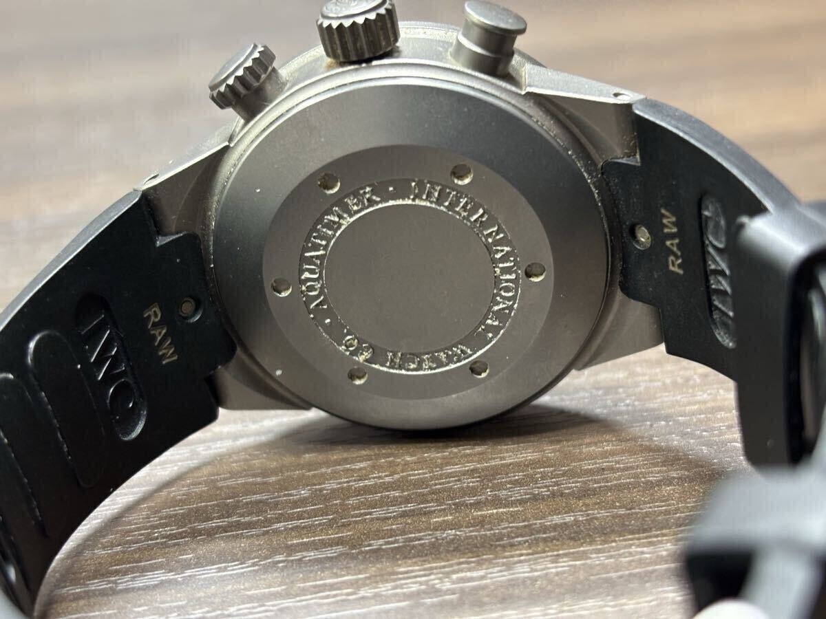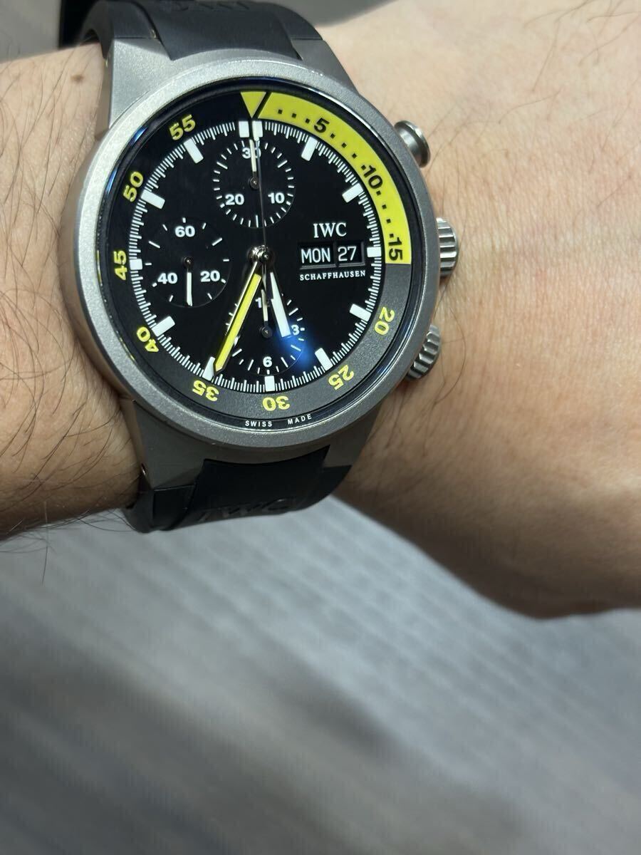 IWC アクアタイマー オートマティック クロノグラフ IW371918 こちらのIW371918は、IWCで高い人気を誇るアクアタイマーシリーズ、生産終了となったモデルです。ブラックに鮮やかなイエローの差し色が映える文字盤は、スポーティで遊び心溢れます。現行モデルは一般的な逆回転防止ベゼルですので、インナーベゼルに拘る方へ大変お勧めです。リューズを4時位置のクロノリセットボタンと一体化させたのも秀逸。 シンプルで上品なデザインこそがIWCの伝統であり、スーツスタイルやカジュアルなスタイルなど幅広くご使用いただけます。 ダイバーズウォッチのアクアタイマーは、蛍光塗料を施したインナーベゼルや太めの指針を採用し、水中や夜間に優れた視認性がございます。 イエローのカラーリングがさらに視認性とデザイン性を高めています。 “時計製造エンジニア”IWCが考案した海の象徴“アクアタイマー”。潜水用に考案された機能的なデザインに加え、海中での過酷な環境にも対応できるよう設計されたモデルです。ダイビングには欠かせない暗所での60分計測計の視認性を確保する為、逆回転防止インナーベゼルを風防内部に納め、特別な蓄光塗料が使用されています。 型番 IW371918 付属品 本体のみ 保証書や箱無し 色 黒文字盤 説明 ムーブメント:オートマ(自動巻き) 防水:120m タイプ:メンズ サファイアクリスタル風防 素材 チタン 純正ラバーバンド 純正SS尾錠 サイズ 【ケース径】: 42mm 【ケース厚み】: 14.2mm 【腕周り】: 20cmまで対応 ●状態良好。多少の使用感はありますが、ベゼル、ケース、裏蓋、ガラス易碎品限空運,非易碎品可使用海運。 風防、いずれも肉眼で目立つような傷はありません。風防は擦り傷も見当たらずキレイです。 チタン製のため、とても軽くて丈夫です。 新品のようには行きませんが、目立つ傷はありません。 とてもオススメだと思います。 カジュアルはもちろん、堅いフォーマルな場でなければビジネス使いもオッケーの優れもの。ラバーもとても丈夫でヘタレもなく、着用感も良好です。 すり替え防止のため返品不可です。 >